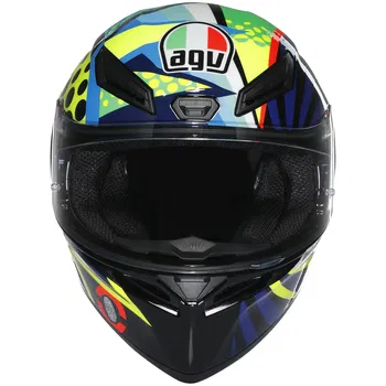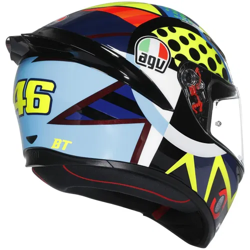 A genuine Valentino Rossi race replica - the Winter Test 2020 graphic. The AGV K1-S full-face motorcycle helmet has a thermoplastic resin outer with four densities of shock-absorbing EPS inner shells. The K1-S has a sophisticated ventilation system with a spoiler, two exhaust fans, five adjustable front vents, and optimal cooling inside. The clear visor is scratch-resistant, has a micro-opening system, is Pinlock prepared and has AGV's X-tra Quick Release System (XQRS), meaning you can easily replace the visor without tools. The removable and washable lining doesn't have stitching on the most sensitive areas and is sanitised with Dry-Comfort fabric for excellent moisture absorption. In addition, it offers recesses for communication systems and grooves for glasses wearers. The K1-S also has a removable nose guard, wind deflector, and an ultra-secure and adjustable double-D ring closure system. It is also available in a wide variety of colours and designs.