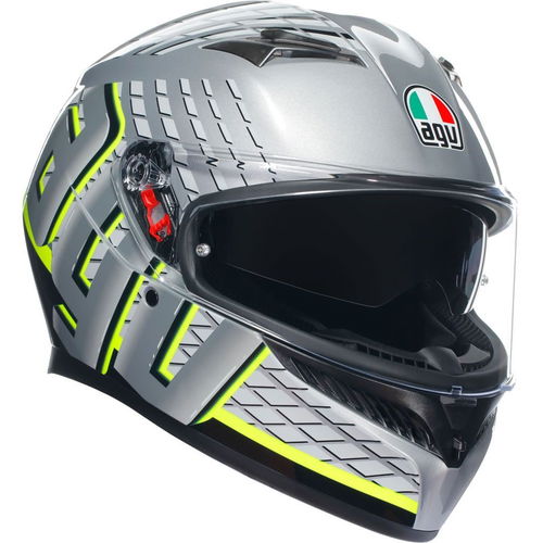 AGV K3 Motorcycle Helmet is AGV's entry-level full-face helmet. The K3 uses AGV's well-proven lightweight (1500g+) HIR-TH (high resistant thermoplastic) resin shell construction, with three shell sizes for superior aerodynamics and comfort. The shell shape is designed to maximise aerodynamic performance and achieve a dynamic weight of 0 at 130km/h (80 mph). In addition, a four-member multi-density EPS inner provides outstanding impact resistance and a curved neck protection profile. The 2Dry fabric lining with instant sweat absorption is fully removable, washable, and seamless in sensitive areas, with recesses for communication systems and grooves for glasses—a sophisticated ventilation system with one rear vent and four adjustable front vents. A clear scratch-resistant visor with a 190-degree horizontal field of view and UV protection is also Pinlock prepared. It features a micro-opening system with a multi-stage visor mechanism with an additional city position visor stage for riding in the city. AGV's patented quick-release mechanism gives added convenience. The integrated Integrated scratch-resistant sun visor can be removed without tools. The micrometric closure system is ultra-secure and adjustable, and the K3 is ECE 22:06 certified. Available in a wide range of colours and designs - this is the Fortify graphic in grey black and flo yellow.