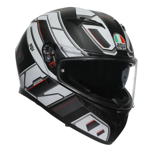 The AGV K3 Motorcycle Helmet is AGV's entry-level full-face helmet. The K3 utilises AGV's well-proven, lightweight (1500g+) HIR-TH (high-resistance thermoplastic) resin shell construction, featuring three shell sizes for superior aerodynamics and comfort. The shell shape is designed to maximise aerodynamic performance and achieve a dynamic weight of 0 at 130km/h (80 mph). Additionally, a four-member, multi-density EPS inner provides outstanding impact resistance and a curved neck protection profile. The 2Dry fabric lining, featuring instant sweat absorption, is fully removable, washable, and seamless in sensitive areas. It includes recesses for communication systems and grooves for glasses, as well as a sophisticated ventilation system with one rear vent and four adjustable front vents. A clear, scratch-resistant visor with a 190-degree horizontal field of view and UV protection is also Pinlock-ready. It features a micro-opening system with a multi-stage visor mechanism with an additional city position visor stage for riding in the city. AGV's patented quick-release mechanism gives added convenience. The integrated, scratch-resistant sun visor can be easily removed without the need for tools. The micrometric closure system is ultra-secure and adjustable, and the K3 is certified to ECE 22:06 standards. Available in a wide range of colours and designs.