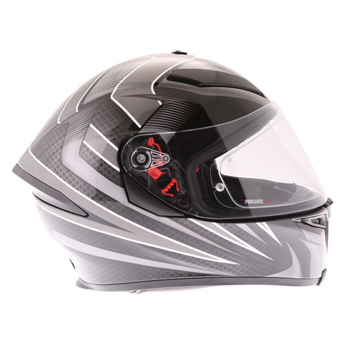 The AGV K5-S Hurricane 2 outer shell in black silver is engineered from a carbon fibreglass mix ensuring it is extremely strong and light, whilst the integrated spoiler ensures aerodynamic performance. The anti-scratch clear polycarbonate visor gives 100% protection from UV rays and has an Anti-Fog Pinlock insert. The Visor ratchet system can be customised; choose from Touring, Race and City by changing the toothed mechanism and the XQRS (Extra Quick Release System) gives tool-free removal and replacement of the visor in seconds. Internally the AGV K5-S has a four-density E.P.S. inner shell for impact absorption and the removeable inner liner is fashioned from high-performance, moisture wicking, fabrics with no stitching in any sensitive areas for a very comfortable fit. Comfort is further enhanced with AGV's IVS (Integrated Ventilation System), the vents are hollowed into the shell and direct air directly on to the rider's head. The 5 front air inlets, 2 rear extractors and micro opening de-mist visor mechanism are all fully adjustable to ensure your head is at its happiest. An Internal drop-down sun visor, Double D retention system, removable nose guard and chin wind protectors add to the high-specification of this AGV helmet. The K5-S Hurricane 2 is also available in different colours.