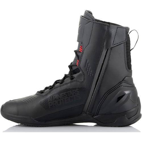 The Alpinestars Superfaster Tech-Riding Shoes provide all-day motorcycling protection with all-day walking and standing comfort. CE EN13634:2017 certified, the Superfaster boots measure around 25 cm tall, which offers the rider better overall coverage and, more importantly, incorporates more sophisticated protection, such as the integrated lower shin impact protector as well as a semi-rigid internal ankle brace system featuring malleolus impact protection and an Achilles extension protector. Double-injected ankle discs, lateral TPR panels on the outer ankle, a reinforced TPU heel counter, and a TPR layered toe box with lateral toe slider reinforcement offer additional protection. The sole features the Alpinestars TPF transversal protection frame midsole, which consists of various layers of protection to prevent the foot from bending or twisting in the wrong direction while simultaneously including soft PU foam, an EVA heel cushion, as well as a removable and breathable OrthoLite insole. The Superfaster chassis is made from advanced Microfibre and Rideknit panels with seamless thermo-welded parts and held securely in place on the rider’s foot with a speed lace system and a long medial side zip opening. The overall design is also sculpted with an engineered flex point for freedom of movement with a pre-bent forward construction for riding comfort and a low overall profile to allow the Superfaster to fit under any riding pants easily. The sole is an Alpinestars' exclusive rubber sole that is highly protective and supportive. It has a walking roll and asymmetric heel shape for better walking stability with enhanced grip.