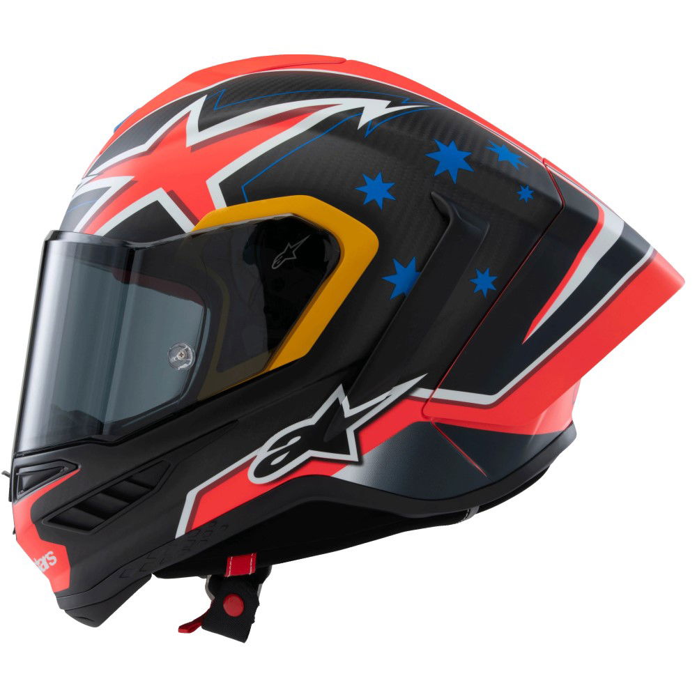 Genuine Jack "Thriller" Miller race replica. Designed and developed for professional MotoGP riders, the Alpinestars Supertech R10 Element is the pinnacle of Alpinestars racing helmets. It minimises drag and ensures optimal aerodynamic stability. Made from an ultra-durable and lightweight carbon outer shell with multi-layer composite construction bonded with advanced epoxy resin to provide strength, mechanical performance and weight ratio, it is ECE 22.06 certified and FIM homologated, weighing just 1540 g +/-50 g (size M). The optimised chin bar gives maximum collarbone protection with a recess in the collarbone area to ensure a softer volume during body contact. The chin bar has a light and robust profile to protect the tip of the driver's chin. External and internal design and material densities have been optimised for maximum protection from linear and oblique acceleration impacts; the entire helmet shape is designed for aerodynamic efficiency and stability: racing spoilers and winglets reduce air resistance by a further 4.54%. The visor mechanism is installed with metal locking levers that prevent accidental release of the visor during impacts and are locked in the closed position by a front metal hook. Alpinestars' quick-release system allows you to change the visor quickly and easily. The extra-wide aperture gives an ultra-wide field of view (220 degrees lateral field of view and 57 degrees vertical field of view). The visor is Pinlock prepared and prepared for Tear-Off films (and comes with a Pinlock insert and Tear-Off foils). The Supertech R10 boasts an ultra-sophisticated ventilation system with eleven vents and exhausts at the chin, top and rear spoiler. It offers Alpinestars' patented A-Head height and angle adjustment system to tailor to the rider's preferences for superior comfort with EPS foam. The removable and washable high-quality inner lining is prepared for the hydration system. Also, it features the Emergency Removal System for the safe and easy removal of cheek pads while the helmet is still on in the event of a collision. It comes with a clear visor, a dark tinted visor, a breath guard, a Pinlock lens insert and Tear-Off foils.