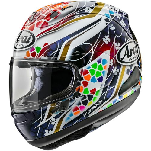 Official race replica of Takaaki Nakagami. The Arai RX-7V Evo motorcycle helmet represents the summit of Arai's knowledge, experience and know-how in helmet technology. With a completely new PB-SNC2 outer shell, the revolutionary VAS (Variable Axis System) visor system and a significantly increased smoother area around the temples, the RX-7V offers a new benchmark in the premium helmet segment. From the also new Eco Pure liner with an even slimmer frame to the new Evo ducts, improved diffuser and integrated Air Channels, every part shows the attention to detail that is so typical for Arai. Arai has continually improved the 'glancing off' performance by learning from real scenarios. Thanks to the new stronger and smoother shell and VAS, the RX-7V Evo is closer to the ideal helmet shape than ever. This offers a full new Evo ventilation system, removable and washable inner padding, which is antibacterial and emergency release cheek pads that allow removal of the helmet without harming the rider in the case of an accident. This also offers a VAS Max Vision visor with a completely new mechanism that facilitates the installation/removal of the visor. There is also a new visor closure system that prevents it from accidentally opening. Comes with Pinlock MaxVision anti-fog laminate as standard for clear vision in any weather condition. The RX-7V Evo closure system is a double buckle, and this comes with a limited 5-year warranty.