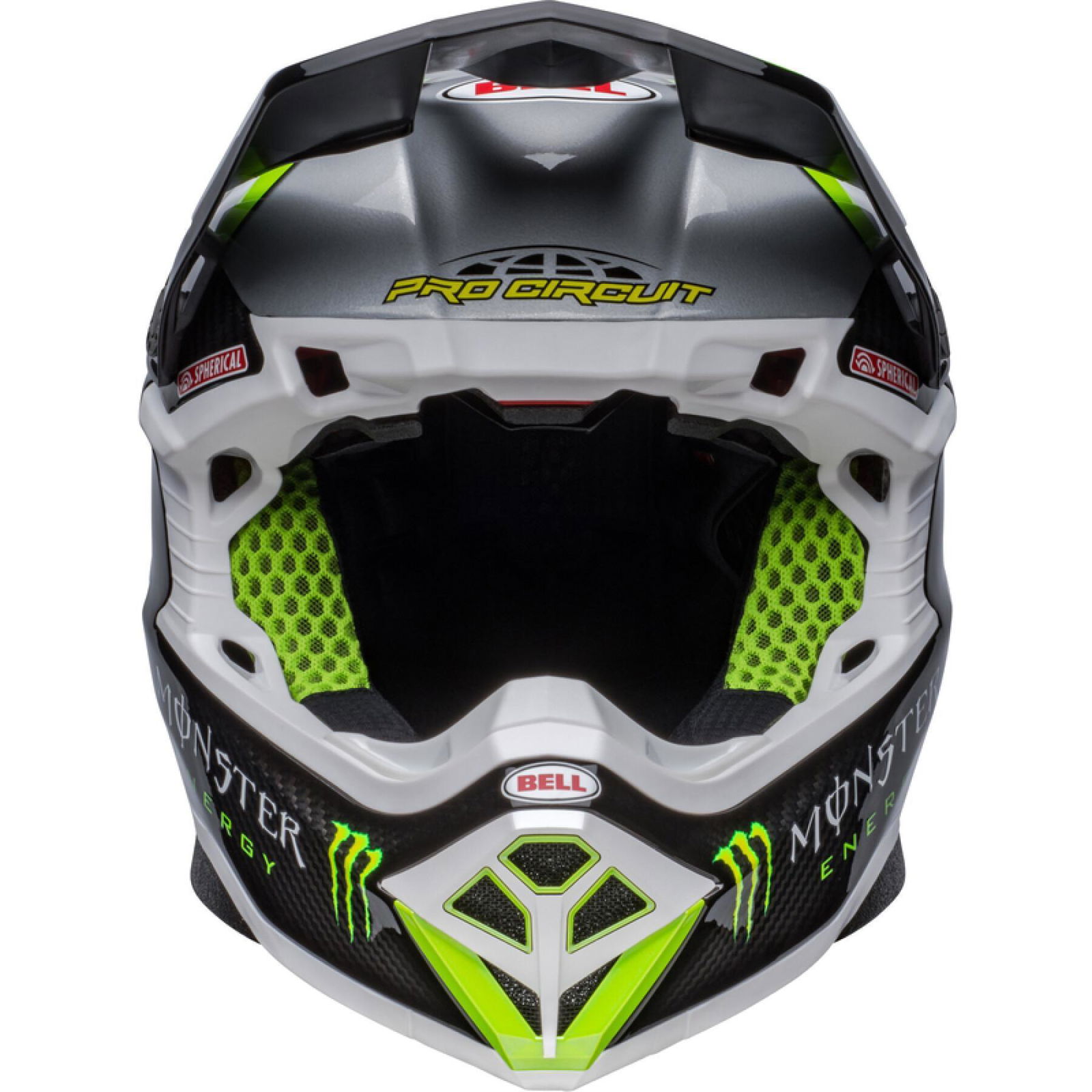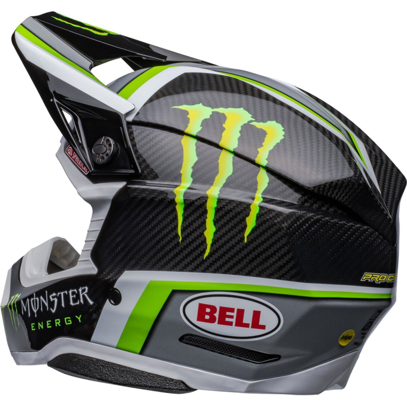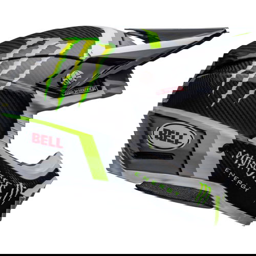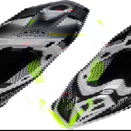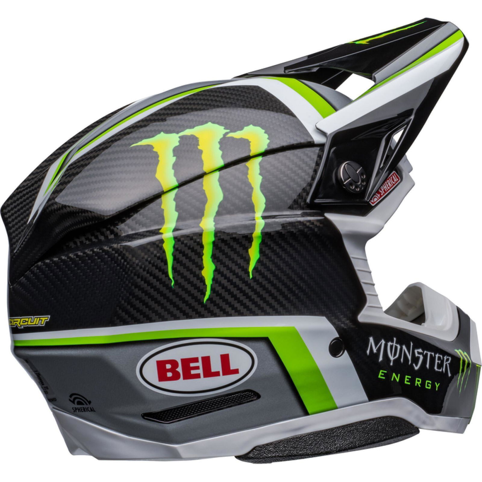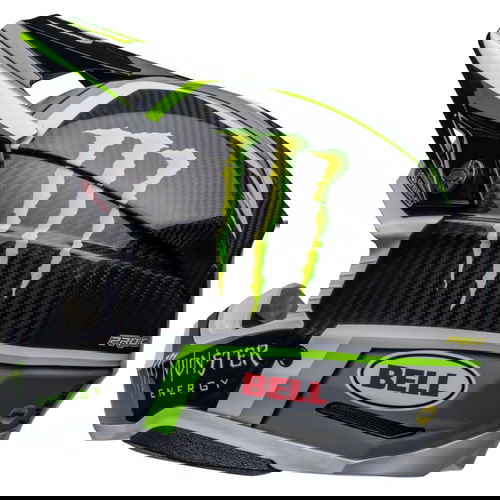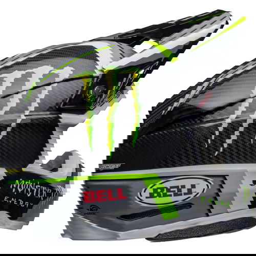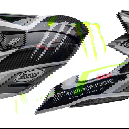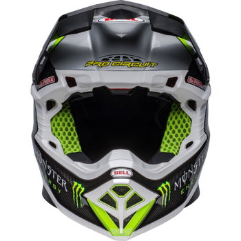 The Bell Moto 10 Spherical Pro Circuit Replica motocross helmet combines performance-driven style with Bell's revolutionary Spherical Technology powered by Mips. The Bell Moto 10 is a direct result of athletes' influence and feedback and achieves a winning combination of increased protection, weight reduction, and extreme airflow, enhancing the rider's experience and confidence. Made from a Segmented 3K Carbon Shell, the Moto 10 is ultra-lightweight and durable with Spherical Technology powered by MIPS, which is designed to provide movement inside the helmet to help reduce the rotational motion of the head in certain angled impacts, thereby lowering the risk of such injuries. NMR (No Missed Races) bumpers on either side of the helmet are made with a softer EPP material that compresses under load but bounces back to its original form, helping to reduce the likelihood of further injury caused by the helmet contacting your body. The Virus CoolJade liner is a removable and washable liner made of fabric that has been infused with recycled jade to create a natural cooling effect. The ultra-wicking construction combined with CoolJade-infused yarn decreases your skin surface temperature up to 10˚ F —keeping you cool, comfortable, and focused on the race at hand. The Magnefusion magnetic cheek pads are easy to remove for washing and enable emergency responders to easily detach the cheek pads first before the helmet following an impact. The Moto 10 Spherical helmet also offers Bell's Thermal Exchange Airflow System (T.E.A.S.), which sucks in cool air like a vacuum and then expels hot air through the side and rear exhaust ports for superior airflow and comfort. With the combination of T.E.A.S., Spherical venting channels, and a segmented shell, the Moto-10 offers superior sweat management and comfort. The Moto-10 offers a Panoramic Goggle port—the largest in the market. The wider port provides better fitment, optimal sealing, and a massive field of view, increasing the rider’s visibility and safety when needed most. The Flying Bridge Visor design allows more flexibility and improves airflow across the helmet. By not using a traditional centre post and screw concept, we’re able to increase the amount of energy management material in a high-impact zone. It weighs 1390G +/- 50G (Size M) and comes with a lined helmet bag.