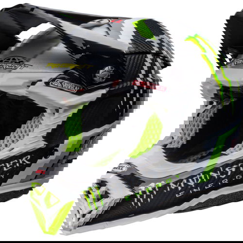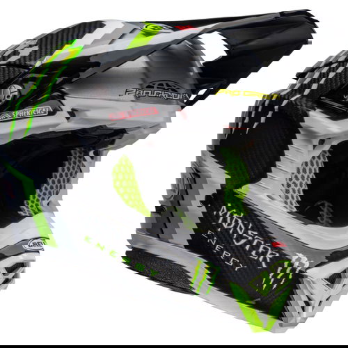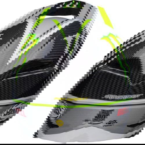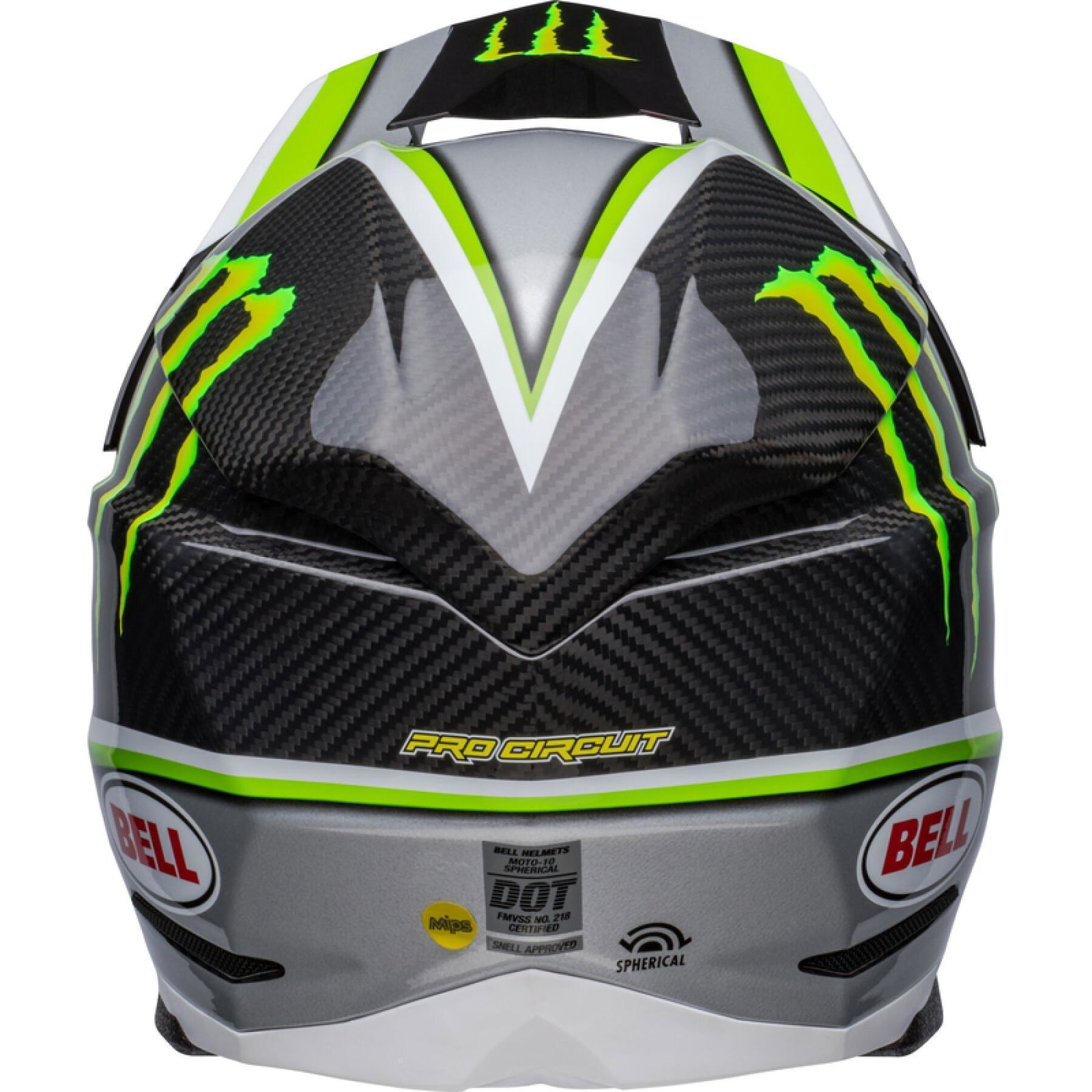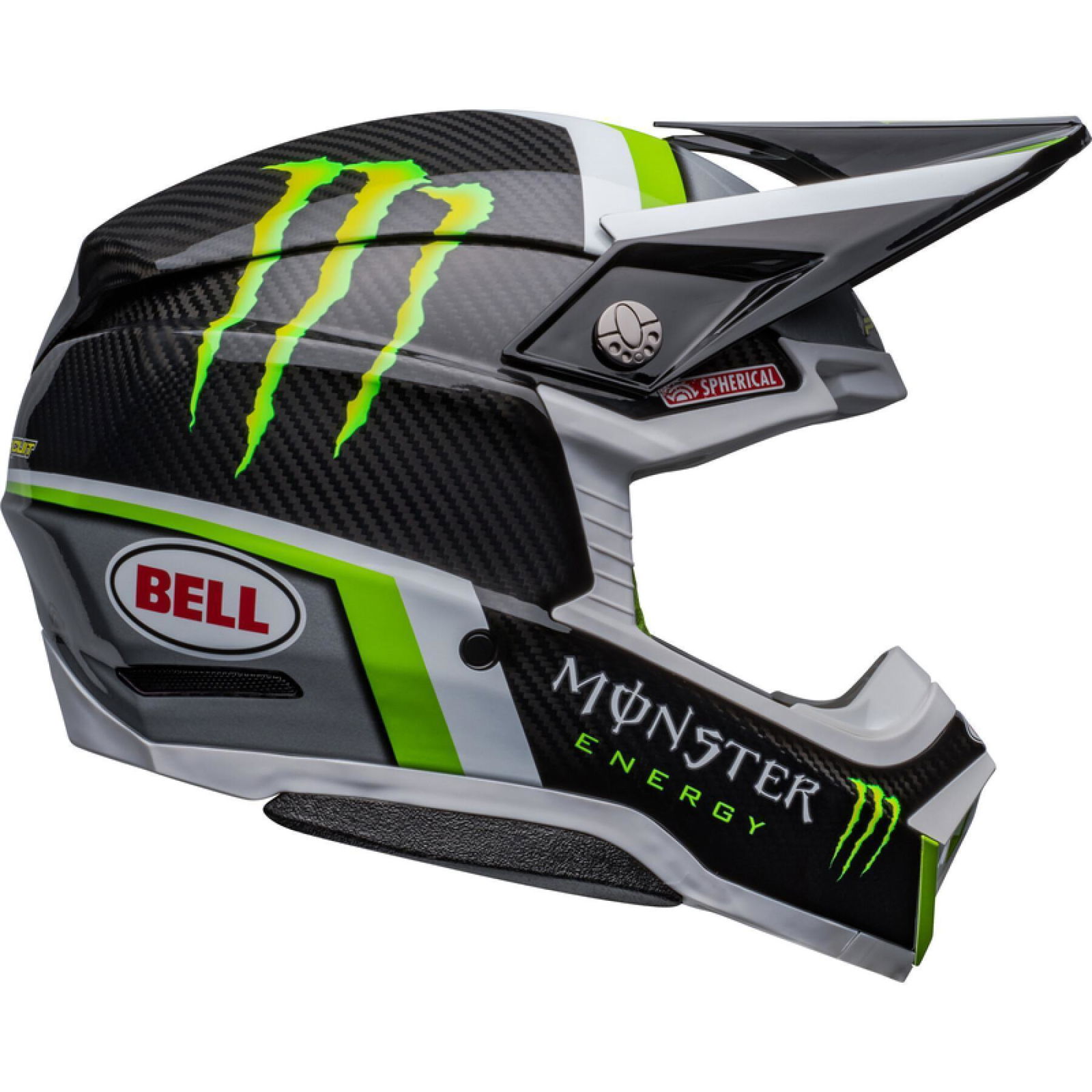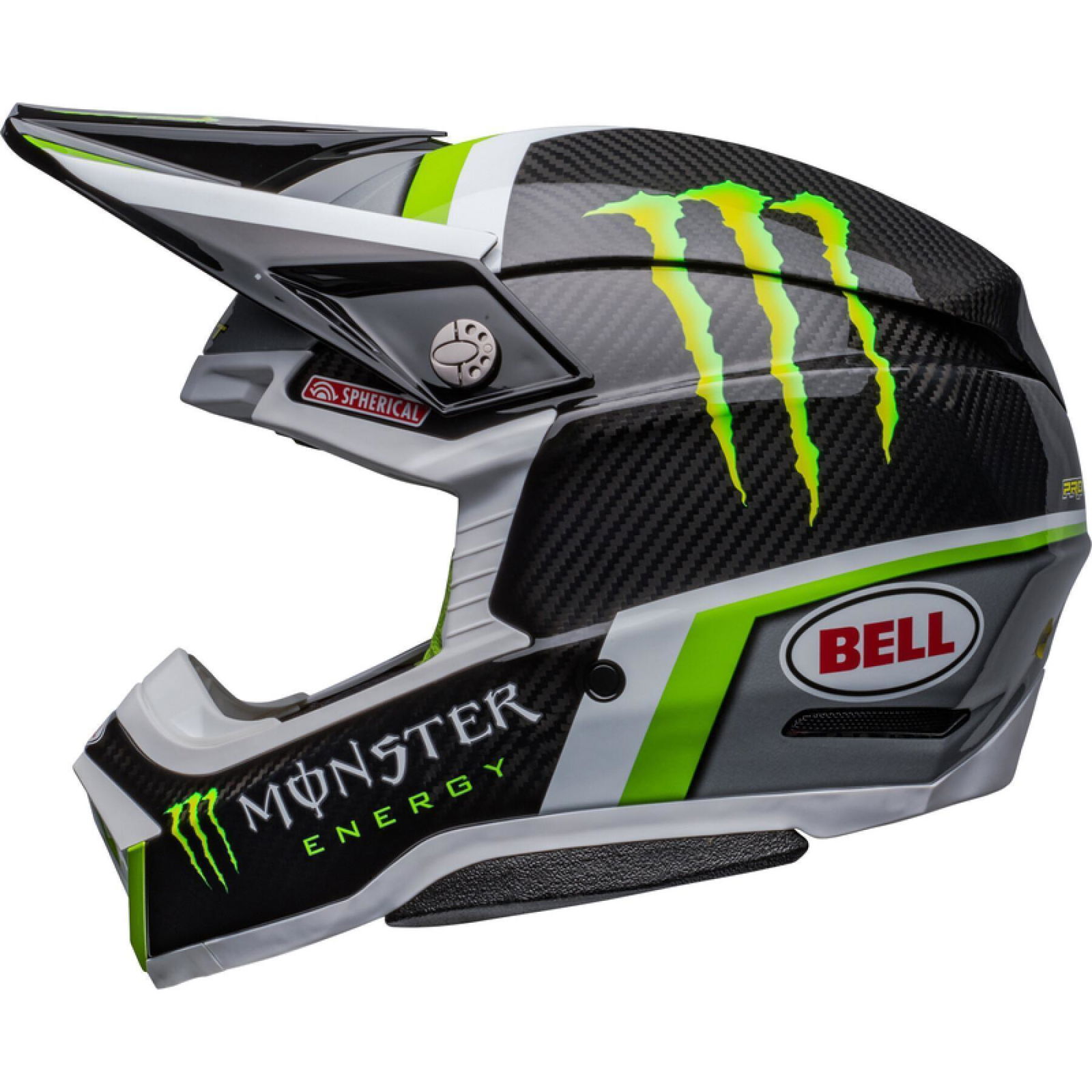 The Bell Moto 10 Spherical Pro Circuit Replica motocross helmet combines performance-driven style with Bell's revolutionary Spherical Technology powered by Mips. The Bell Moto 10 is a direct result of athletes' influence and feedback and achieves a winning combination of increased protection, weight reduction, and extreme airflow, enhancing the rider's experience and confidence. Made from a Segmented 3K Carbon Shell, the Moto 10 is ultra-lightweight and durable with Spherical Technology powered by MIPS, which is designed to provide movement inside the helmet to help reduce the rotational motion of the head in certain angled impacts, thereby lowering the risk of such injuries. NMR (No Missed Races) bumpers on either side of the helmet are made with a softer EPP material that compresses under load but bounces back to its original form, helping to reduce the likelihood of further injury caused by the helmet contacting your body. The Virus CoolJade liner is a removable and washable liner made of fabric that has been infused with recycled jade to create a natural cooling effect. The ultra-wicking construction combined with CoolJade-infused yarn decreases your skin surface temperature up to 10˚ F —keeping you cool, comfortable, and focused on the race at hand. The Magnefusion magnetic cheek pads are easy to remove for washing and enable emergency responders to easily detach the cheek pads first before the helmet following an impact. The Moto 10 Spherical helmet also offers Bell's Thermal Exchange Airflow System (T.E.A.S.), which sucks in cool air like a vacuum and then expels hot air through the side and rear exhaust ports for superior airflow and comfort. With the combination of T.E.A.S., Spherical venting channels, and a segmented shell, the Moto-10 offers superior sweat management and comfort. The Moto-10 offers a Panoramic Goggle port—the largest in the market. The wider port provides better fitment, optimal sealing, and a massive field of view, increasing the rider’s visibility and safety when needed most. The Flying Bridge Visor design allows more flexibility and improves airflow across the helmet. By not using a traditional centre post and screw concept, we’re able to increase the amount of energy management material in a high-impact zone. It weighs 1390G +/- 50G (Size M) and comes with a lined helmet bag.