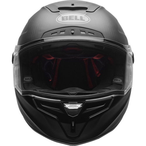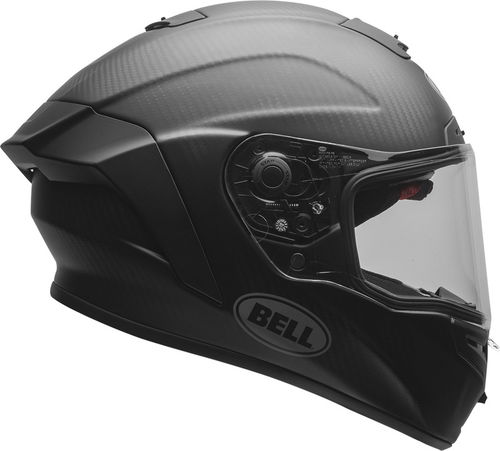 The Bell Race Star Flex DLX helmet boasts an ultra-lightweight (1250g) 3K Carbon fibre shell with a Raceview profile shell for enhanced aerodynamics. It offers Bell's Velocity Flow Ventilation system with a Virus CoolJade anti-microbial comfort liner for maximum cooling. The Panovision Protint Photochromic visor is installed for superior vision. Magnefusion magnetic cheek pads are ultra-convenient and versatile, plus the ultra-plush flex impact lining is fully removable. The Bell Race Star comes with a Bell helmet bag, is glasses compatible, and has a double D-ring retention system. Available in a choice of colours - this is the matt black colourway.