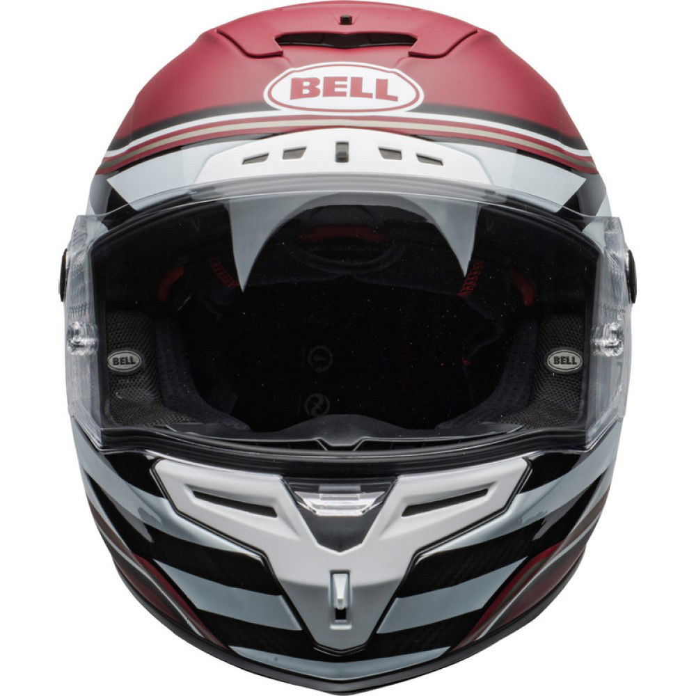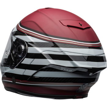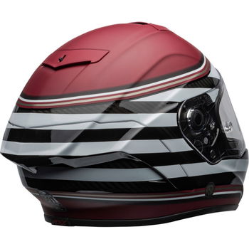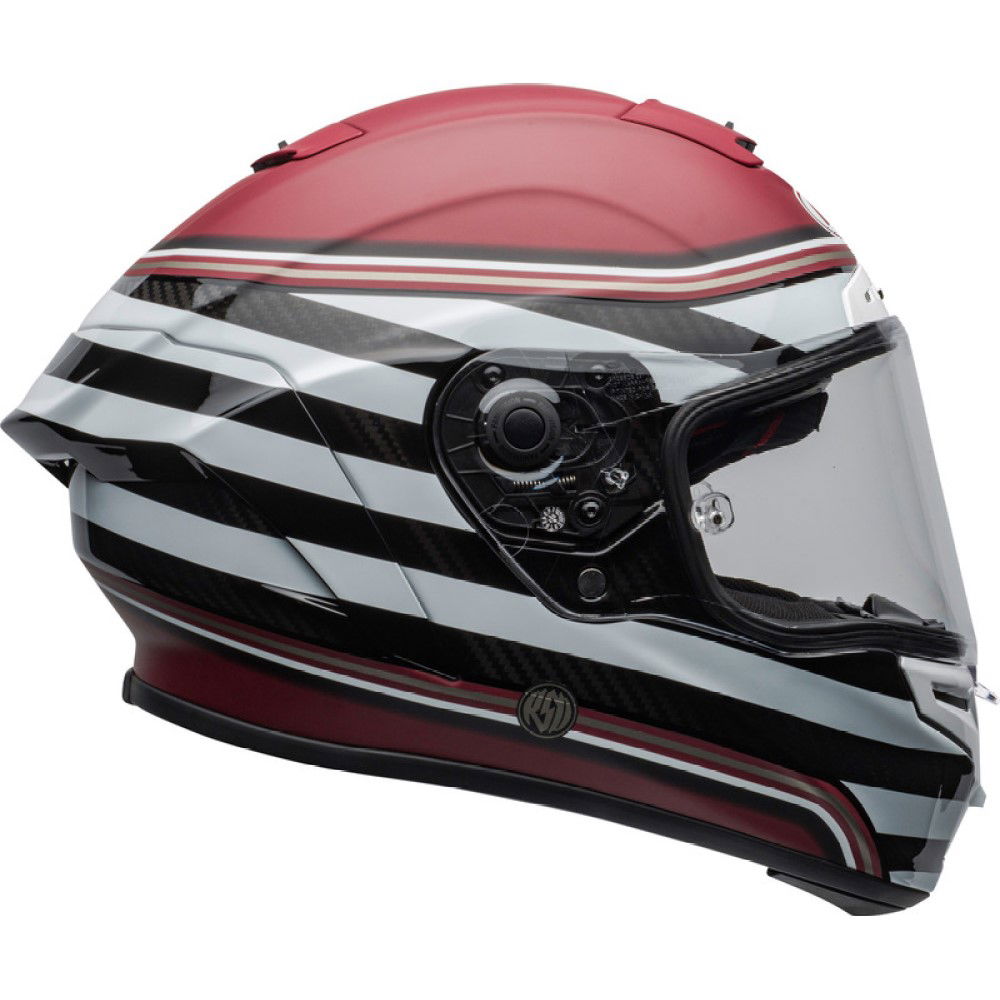 The Bell Race Star Flex DLX RSD The Zone motorcycle helmet boasts an ultra-lightweight (1250g) 3K Carbon fibre shell with a Raceview profile shell for enhanced aerodynamics. It offers Bell's Velocity Flow Ventilation system for maximum cooling with Virus CoolJade anti-microbial comfort liner. The Panovision Protint Photochromic visor is installed for superior vision. Magnefusion magnetic cheek pads are ultra-convenient and versatile, plus the ultra-plush flex impact lining is fully removable. The Bell Race Star comes with a Bell helmet bag, is compatible with glasses, and has a double D-ring retention system. Available in a wide choice of colours and designs.