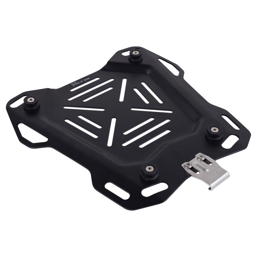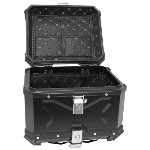 The Bike It 36 Litre Rigid Aluminium Luggage Top Box is made from high grade aluminium that is ultra-lightweight but extremely robust. The contoured design strengthens the top box and strong polymer corner bumpers gives added durability. It comes with a universal mounting plate with a locking quick-release buckle to enable swift removal and fitting of the top box. It holds 36 litres and has a premium padded internal leather-look liner that provides insulation and internal protection with added storage slots in the lid liner. A strong key lock mechanism keeps your items secure. Mounting points at the corners enables additional items to be strapped to the top box. Recommended maximum load 10kgs.