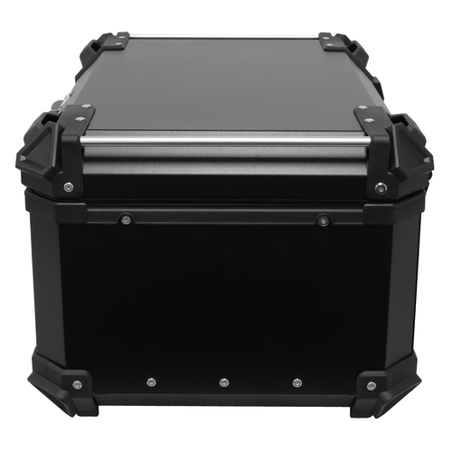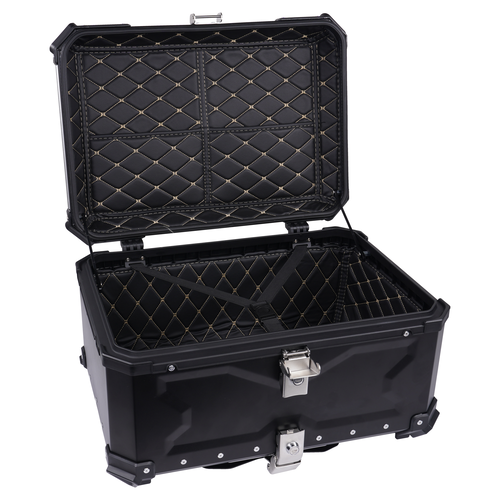 Made from high-grade aluminium, the Bike It deluxe aluminium top box is lightweight but extremely robust, offering perfect on-bike storage solutions for scooters and motorbikes. They are ideal for scooter delivery purposes. A contoured edging design strengthens the top box to be sturdy and rigid with extra strong polymer corner bumpers. It comes with a universal mounting plate with a locking quick-release buckle to enable swift removal and fitting of the top box. A premium padded internal leather-look liner provides insulation and internal protection with handy storage slots in the lid liner. A strong key lock mechanism for security and mounting points at the corners enables additional items to be strapped to the top box. It also offers 65L storage capacity and a max load of 10kgs. It measures 57x31x40cm (WxHxD) and has reflective decals for maximising night visibility.