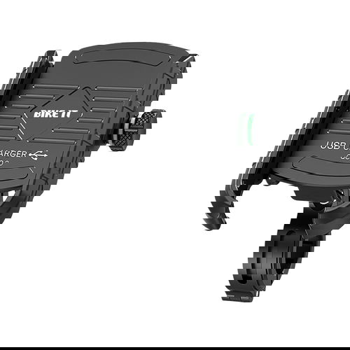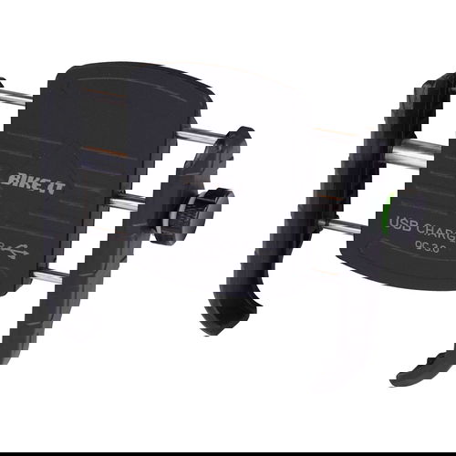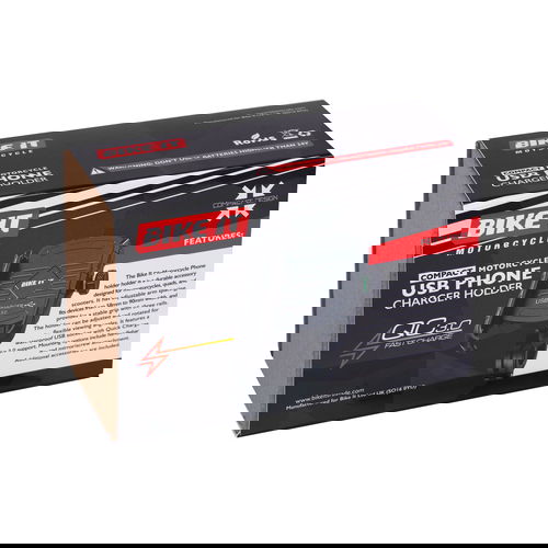 The Bike It compact motorcycle phone holder is a reliable and durable accessory perfectly suited for motorcycles, quads, and scooters. Engineered with both resilience and functionality in mind, it seamlessly merges form and practicality. Adjustable arm spacing Width 58 - 90 mm - Depth 11 mm ensures this holder accommodates a wide range of phones. The three-rail system ensures a secure grip, guaranteeing the safety of your device during your rides.360-degree rotation allows various viewing angles with easy and simple adjustment for optimum visibility. It has a weather-resistant USB socket equipped with Quick Charge 3.0 support to ensure your device remains charged even during inclement weather. The option for handlebar or mirror/screw attachment offers versatility in installation, catering to your preferences. The intelligent and quick charge is ultra-convenient with an ON-OFF switch and is ultra-lightweight and durable thanks to the PA66 nylon FGF reinforced construction.
