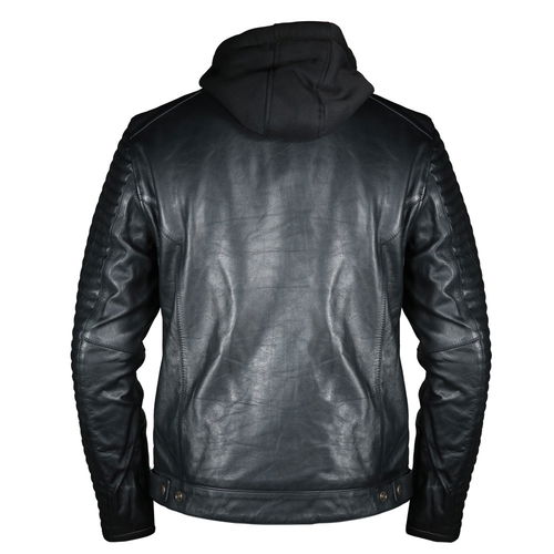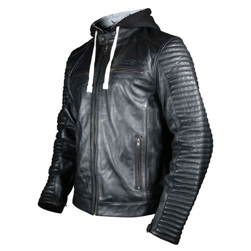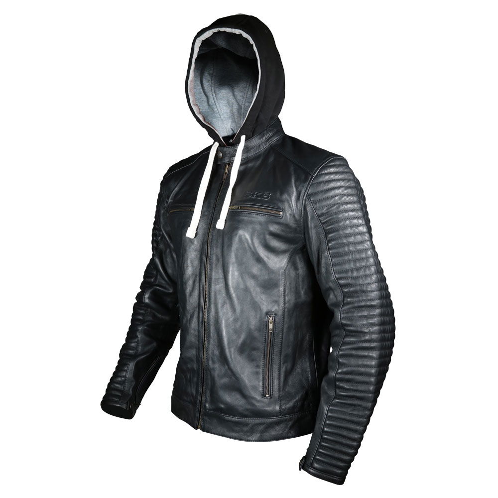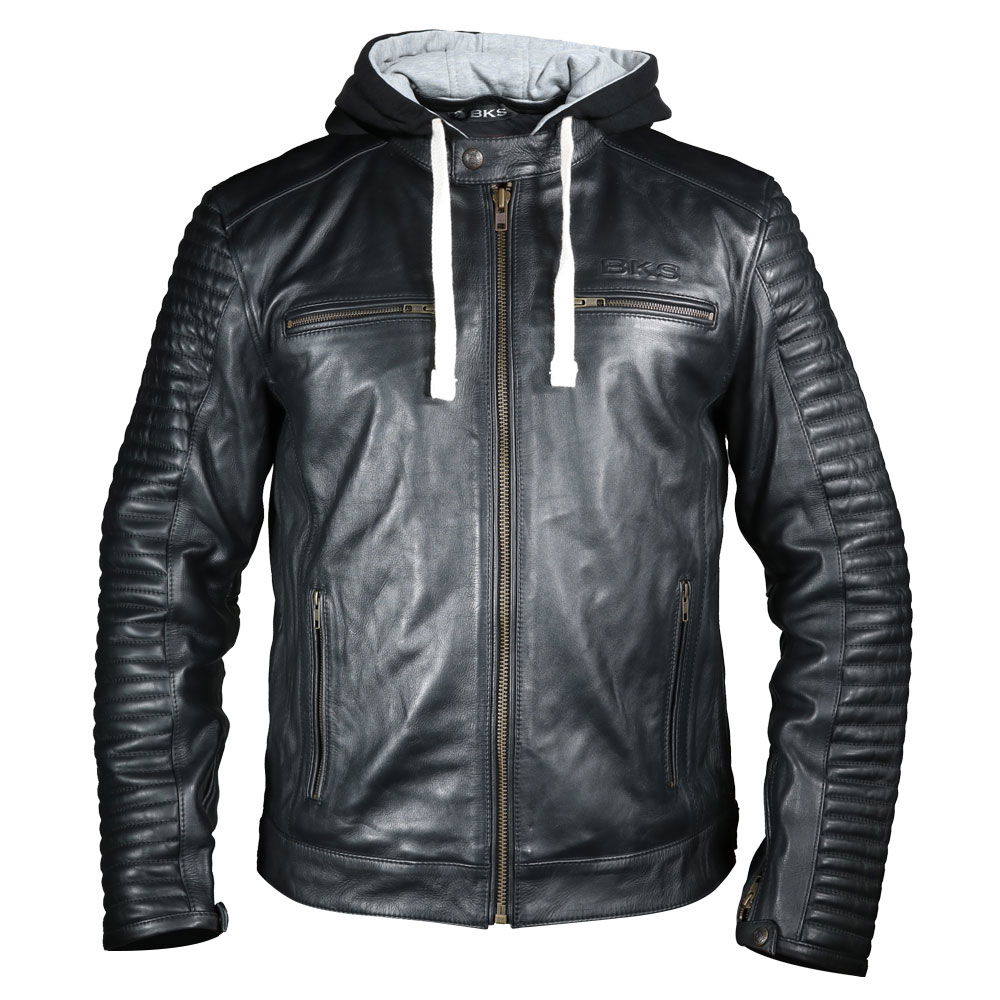 The retro-inspired BKS Vulcan leather jacket has all the features of a vintage leather jacket with modern design features, such as a removable jersey hood and CE EN 17092-3:2020 AA certification. Made from The retro-inspired BKS Vulcan leather jacket has all the features of a vintage leather jacket with modern design features, such as a removable jersey hood and CE EN 17092-3:2020 AA certification. Made from ultra-supple and soft-to-the-touch premium aniline cowhide, the Vulcan jacket boasts CE-Certified Level 1 armour at the shoulders (SW 102) and elbows (SW 101) with a recess for a back protector (sold seperately). The retro design includes quilted detailing up the whole arm, which acts as additional padding for further protection. YKK brushed copper zips used throughout give secure closure to the main zip, as well as four zipped storage outer pockets and cuffs with press-stud fastening for additional security at the cuffs. A cotton quilted inner lining gives superior comfort and features one zipped pocket and a phone pocket. The rear is elongated to prevent wind ingress, and the jacket's base offers press-stud adjustability for the perfect fit. Subtle BKS branding finishes the look - a stylish jacket for on and off the bike.