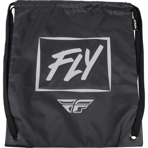 The Fly Racing quick draw backpack in black is made from 210D polyester fabric with polyurethane (PU) coating for durability. It measures 46cmx38cm and has a volume of 13.2L. On the front is a printed FLY Racing logo, and flat lace straps give quick closure. Other colours are also available.