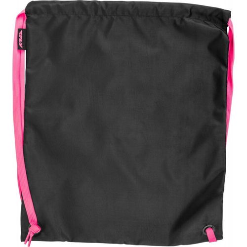 The Fly Racing quick draw backpack in pink and black is made from 210D polyester fabric with polyurethane (PU) coating for durability. It measures 46cm x 38cm and has a volume of 13.2 Litres. On the front is a printed FLY Racing logo, and flat lace straps give quick closure.