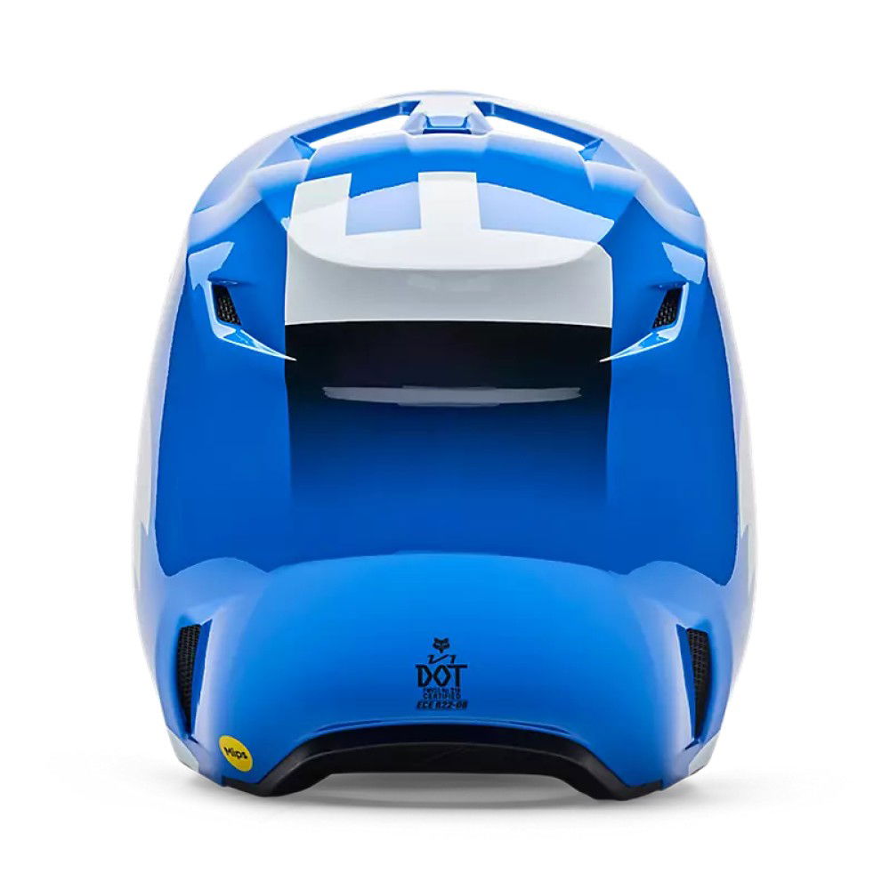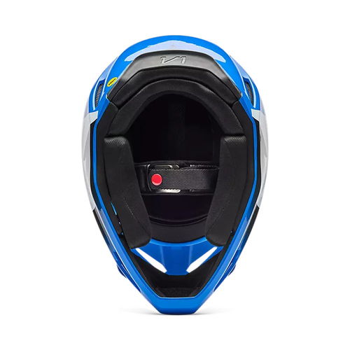 The Fox Racing V1 Shield Blue MX motorcycle helmet is an ultra-lightweight motocross helmet made from a lightweight injection-moulded Polycarbonate and ABS shell with four shell sizes and six EPS sizes for a precise fit. A removable and washable plush liner and customisable cheek pads keep you comfortable. It also benefits from MIPS (Multi-Directional Impact Protection System) - a low-friction layer that reduces the rotational energy transmitted. The Fox V1 Taunt also features a removable ventilation cover in the chin guard area, a padded EVA chin guard, an adjustable visor with removable screws and a steel double-D ring chin strap closure. It offers optimum airflow for maximum comfort and meets ECE 22.06 certification.