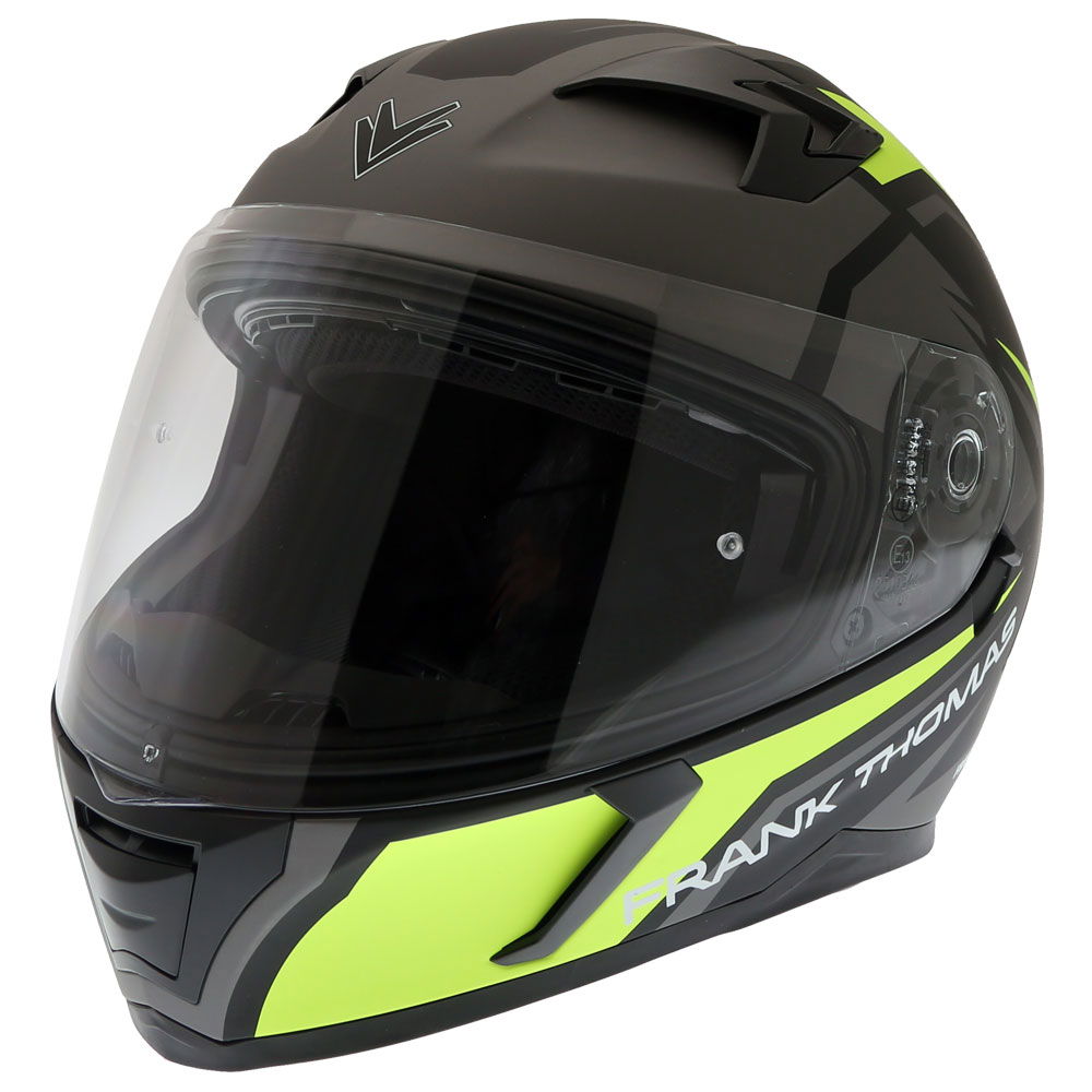 The Frank Thomas FT39SV Nautilus full-face motorcycle helmet is a road racing helmet with an ultra-lightweight polycarbonate shell with an aggressive aerodynamic design. A personalised ventilation system with sealable vents and exhausts provides optimum air circulation for superior comfort. The comfort lining is mesh lined to keep you fresh, is fully removable and washable, and features recesses for speakers (sold separately). The clear anti-scratch visor is quick-release for added convenience, and this also comes with a retractable internal sun visor to prevent sun glare. The sun visor is operated with an easy-access button at the side, which is easy to use with your gloves on! The micro-ratchet retention strap is safe and easily adjustable. Available in a choice of colours, finishes and designs. This is the Matt Yellow colourway in a hi-viz yellow - an exclusive design by Franzandesign! The Pinlock DKS002 insert fits this helmet.