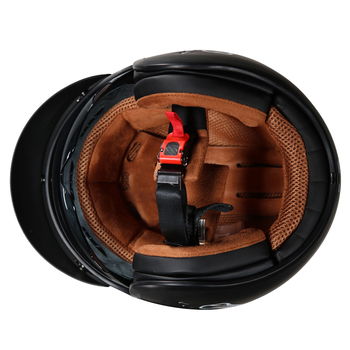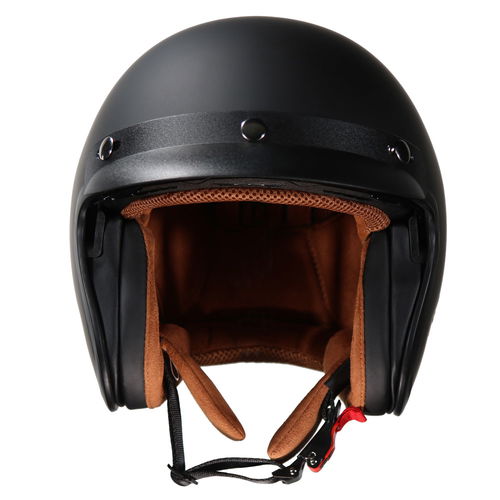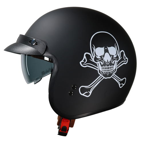 The Frank Thomas Open Face Skull and Crossbones motorcycle helmet is a classic-styled open-face helmet constructed from ultra-lightweight Thermoresin (1100 ± 50 g, size M). It boasts an integral dark sun visor, a removable peak, and a removable and washable comfort liner. The micro ratchet retention system gives a secure and custom closure, and this is ECE 22.06 approved.