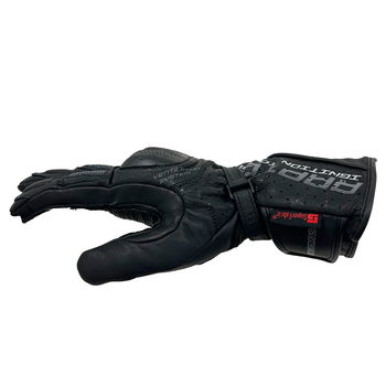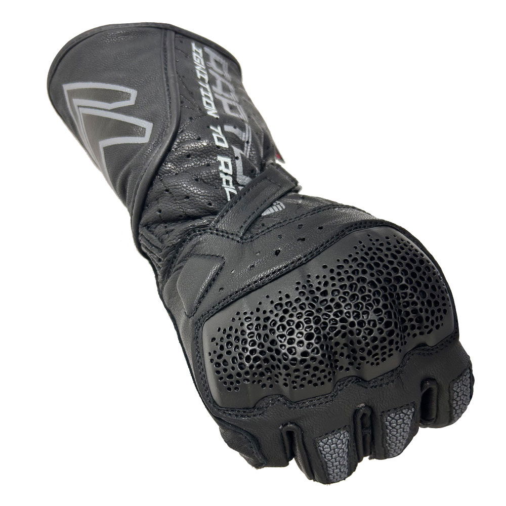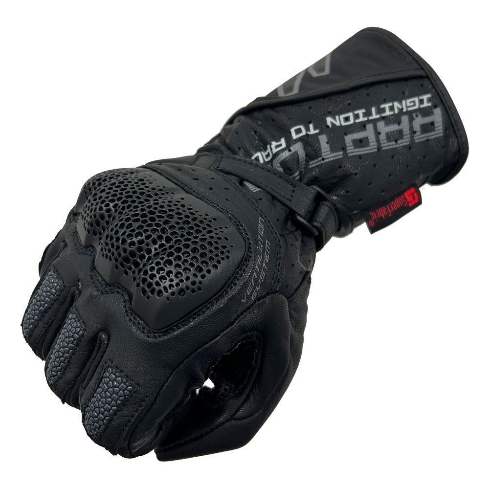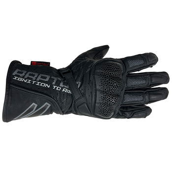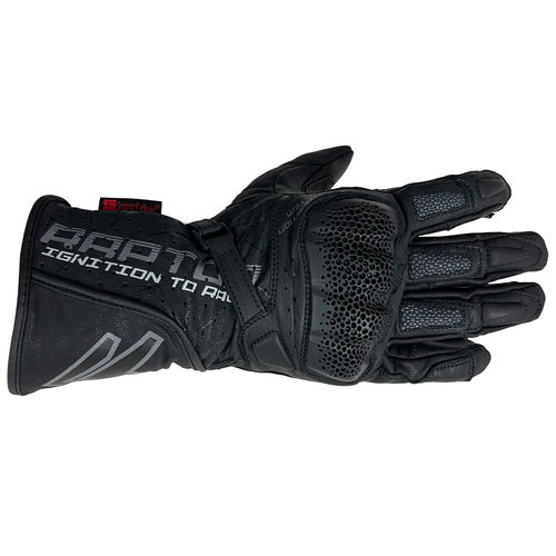 A premium leather glove that meets CE Standard 13594:2015, the Frank Thomas Raptor glove in black features knuckle protectors for superior protection. Padding in key areas provides additional security with Superfabric inserts and double-layer palm protection. Perforations in key areas enhance airflow for exceptional comfort, and added grip provides greater feedback. Elastication and an adjustable wrist strap provide a perfect fit, and a conductive index finger allows use with touchscreens. The leather is super-supple for optimum comfort without sacrificing durability. Frank Thomas branding throughout. Available in a choice of colours.