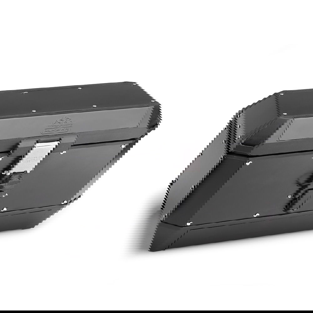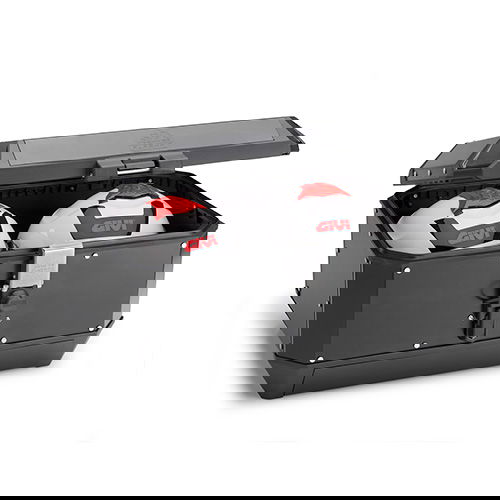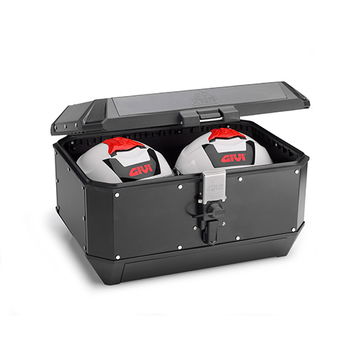 The Givi Trekker Alaska motorcycle case offers a 56-litre volume, which comfortably holds two modular helmets. Made from aluminium, matt black painted, it is ultra-durable yet lightweight. It features the world’s most widespread fixing system, MONOKEY, which allows for a single lock to open and release the plate with the same key. Compatible with all Monokey plates, apart from those with the stop light kit connection. Givi's Wire Release System allows for release from the plate by turning an external knob equipped with a patented cable system, placed directly under the Security Lock. It is not necessary to turn the knob to attach the cases. Two handles are placed on the back of the top case, which are also integrated with the strong hinges on the lid, allowing the latter to open more fully without the need for classic retention cables: once opened, the lid is held in position to make packing/unpacking easier. Four belt-strap loops are integrated into the lid's structure, set into the contoured lid to give an elegant shape to the whole case. The Trekker Alaska allows the attachment of a backrest (sold seperately) using screws, without the need to pierce or attach any component with adhesive. It also offers rivets fitted with gaskets and sealed using silicone, to ensure watertightness even under the worst riding conditions. A series of grips built into the interior, integrated into the supporting structure, allow loads to be attached to both the lid and bottom of the case. Measures 230 x 559 x 463.