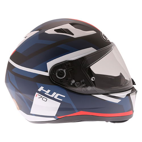 The HJC I70 full face motorcycle helmet Elim red black blue white is made from a lightweight advanced polycarbonate shell with a Vision Plus (+10mm) wide visor providing enhanced visibility along with an integrated sun visor - both are scratch-resistant and a Pinlock visor is included. A full ventilation system with lower vents and top vents to allow superior airflow around the head to keep you fresh along with removable and washable lining. The I70 is suitable for glasses wearers with funnels for a more comfortable fit. Other colours available.