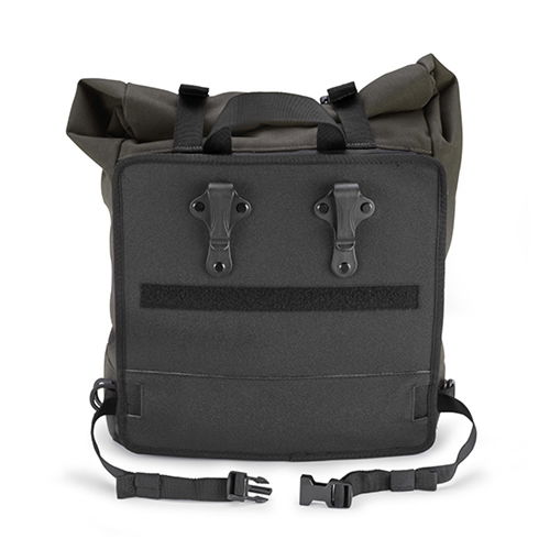 The Kappa RB105R is a retro-styled single-side bag that doubles as a stylish backpack. It features a 17-litre volume and is made from 470 Denier recycled nylon in dark green; it features a non-removable waterproof 70D 190T nylon inner lining undyed to conserve water resources, preventing the release of run-offs from dyeing into the groundwater and saving the energy that would be required for the process. It has non-slip fabric on the back and a system of fixed plastic hooks that allow fixing to Kappa TMT_K and TE_K frames. It has a roll-top closure with hook and loop fastening, a front pocket, a front handle and straps to wear this as a rucksack. A lower strap allows attachment to the frame, and it has a front M.O.L.L.E. system. Measures 40cm x 15 cm x 28 cm.