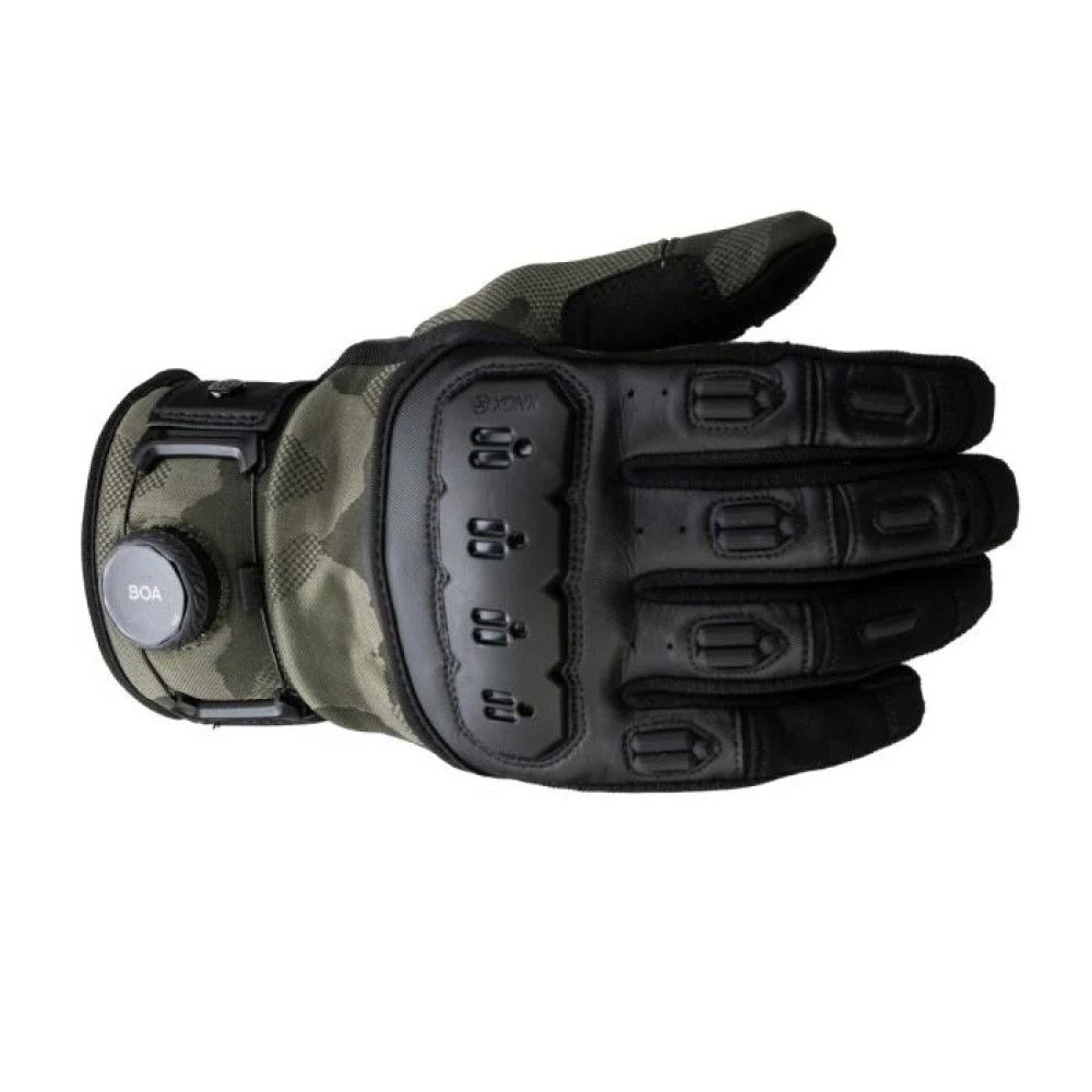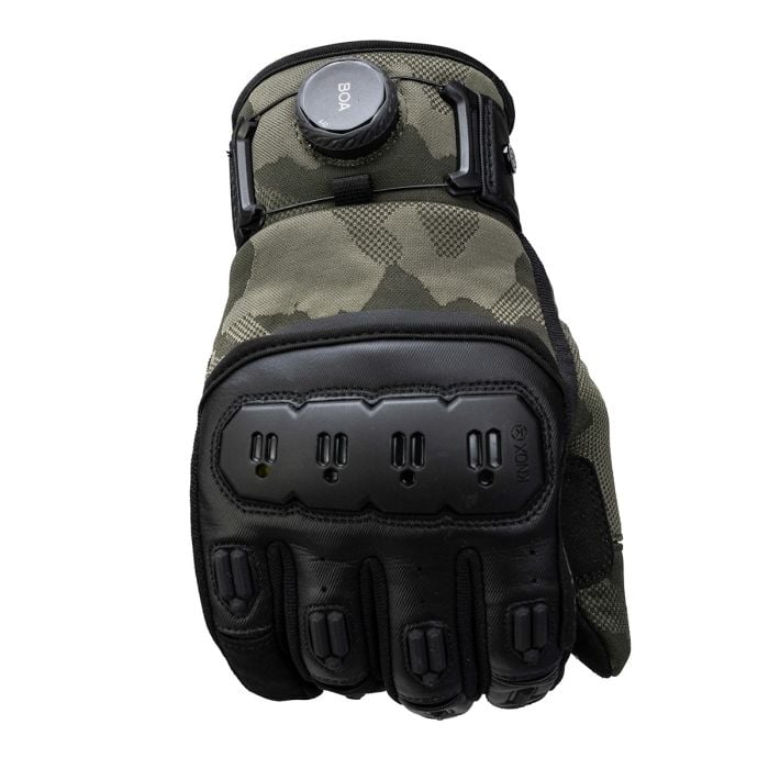 The best-selling Orsa OR3 has had an update. Made from a mix of vegan leather and monochrome camo stretch fabric for a fantastic fit, it is CE-approved for superior protection. A single-layer Clarino breathable performance palm gives the maximum feel and additional protection with an Amara grip pad overlay. Knox Micro-Lock-filled plastic floating knuckles provide superior comfort and protection when riding. A stylish dark reflective print rests under the floating knuckle. This print is subtle during the day but reflects under lights for subtlety during the day but has maximum visibility at night. Moulded TPR on the fingers provide extra abrasion resistance with the patented Knox Impact Scaphoid Protection System (SPS) with Micro-Lock on the palm (Patent No EP1594378) to eliminate the grab effect that occurs when a leather palm makes contact with the road, reducing the risk of hyper extension which can be the cause of a broken scaphoid. The unique Boa fit system gives an improved dialled-in precision and micro-adjustable secure fit around the wrist for a custom and superior fit, and these are touchscreen enabled. Available in a choice of stylish colourways.