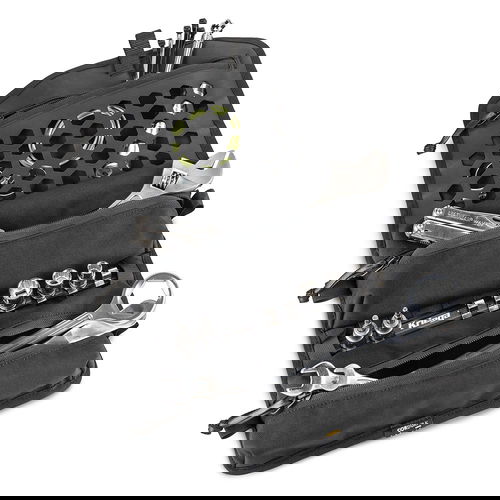 The Kriega OS-TOOL ROLL is the ‘Big Brother’ to the standard Kriega Tool-Roll. It has enough width to accommodate Motion-Pro type tyre leavers and is an alternative to elastic loop storage with heavy-duty zipped pockets and a socket rail design. It is ultra-durable and made from 1000D Cordura and Hypalon. Three YKK zipped pockets and compartments offer more than enough room for your essential tools. The hook closure and adjustable cam fastening system keep your tools tightly in place, preventing any unwanted rattling or shifting while you're tearing up the trails. The T6 alloy socket rail with 8 x 3/8” keeps your sockets in order and allows you to grab the right tool at the right time without fuss. Alternative size 1/4” and 1/2” socket rails are also available as accessories. A YKK zipped Hypalon mesh pocket and inner sleeve pocket provide a separate storage location for smaller items. It measures 460 x 270mm / 18 x 10.6 inch unfolded and weighs 405g / 14.2oz. It also has a fantastic 10-year manufacturer's warranty.