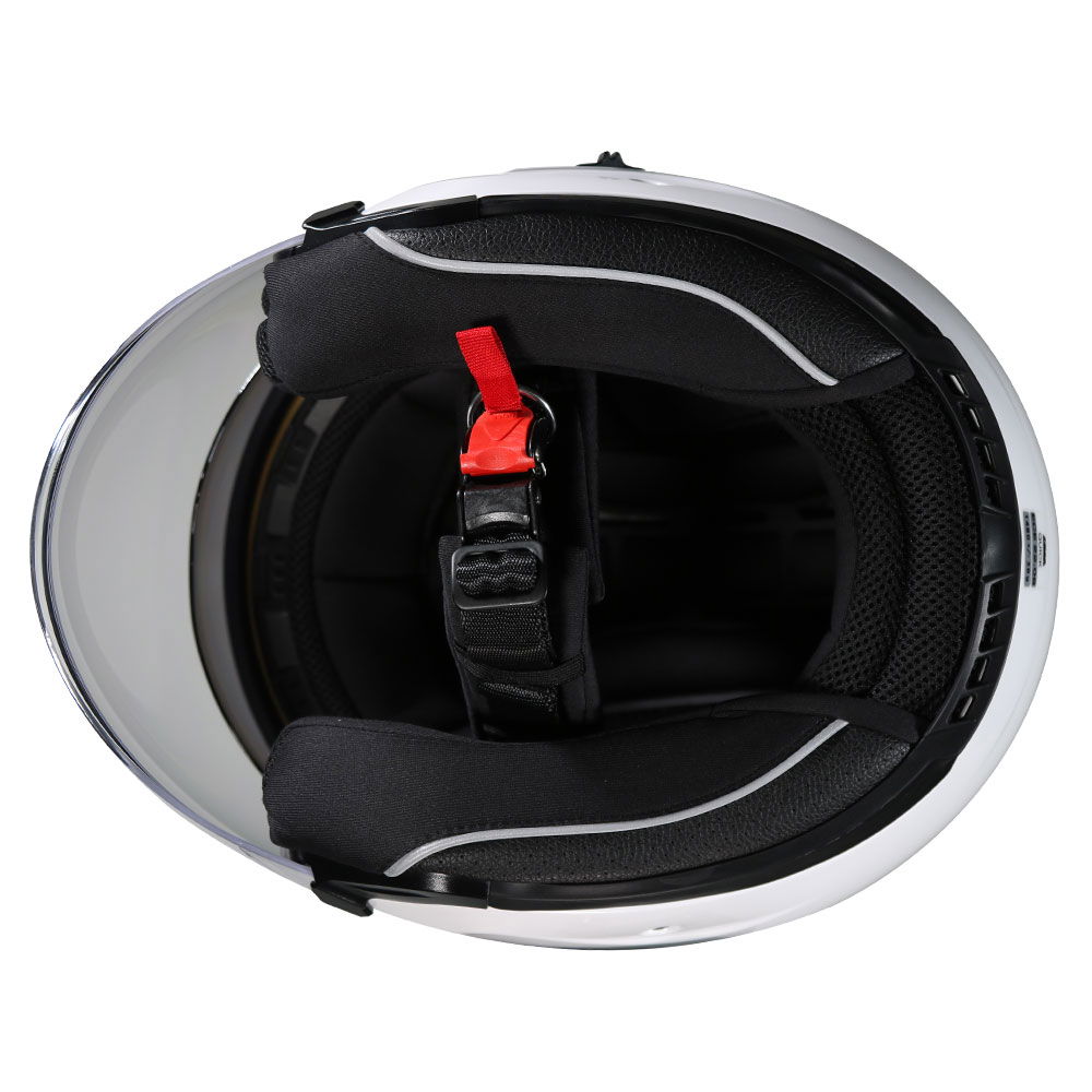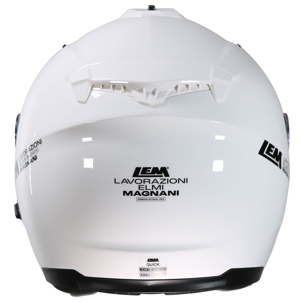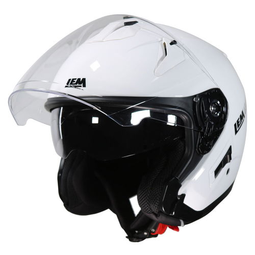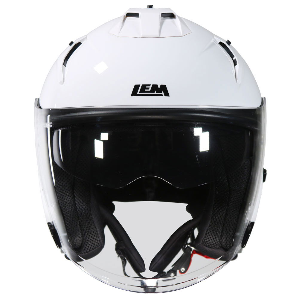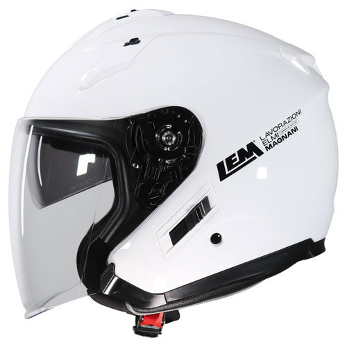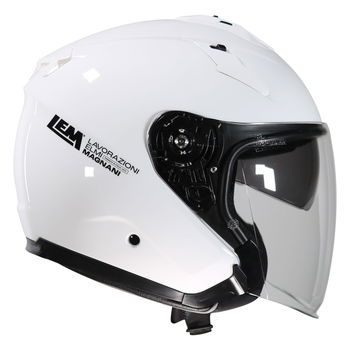 The Lem Quick helmet in white is an open-face helmet with an elongated clear visor for outstanding vision and protection. Made from lightweight polycarbonate, it weighs 1350 grams in size M (+/- 50 grams for size). Inside is a soft and breathable antibacterial fabric that is removable and washable. The Quick offers outstanding vision thanks to the transparent polycarbonate visor with anti-scratch treatment and an inner dark-tinted sun visor (Dual Visor System) that is easy to use while wearing gloves. The elongated visor protects from the elements while not compromising vision. The adjustable ventilation system, comprising three upper vents and rear vents, gives superior air circulation. It comes with a helmet bag and a micrometric buckle for an adjustable and secure closure. ECE 22.06 certified. Available in a wide choice of colours.