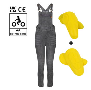 Dungarees!! Not just dungarees, but ladies' dungarees designed specifically for motorcycling! The MotoGirl Daisy dungarees offer UKCA and CE Class AA Certification with CE Level 2 knee and hip armour with height-adjustable knee protector pockets for the perfect - and safe - fit. The Daisy dungarees boast a stretchy material construction for outstanding freedom of movement and comfort with side zip closure and adjustable braces for the best fit. A large front bib zip pocket and deep front and back pockets give convenient storage, and MotoGirl branding on the back looks great.