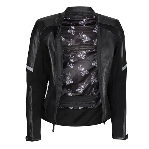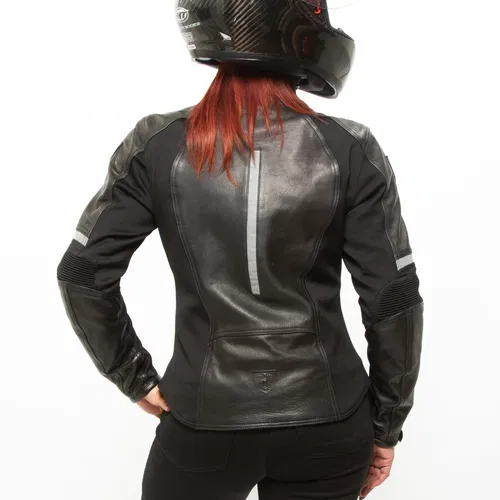 The MotoGirl Fiona ladies' motorcycle jacket is ideal for summer. Constructed from leather and MotoGirl's Sherrie fabric, which offers additional stretch, For every MotoGirl Fiona Jacket sold, contribute towards Ovarian Cancer Awareness! It is CE & UKCA Certified Garment - AA rated with CE Level 2, tested and approved shoulder & elbow protectors included and a pocket for a back protector (not included). It features stretch panels for excellent movement and comfort and reflective strips on the arm and back for enhanced visibility. An eye-catching and luxurious printed inner lining looks and feels great, and this also has two front zipped pockets and an inside zip and Velcro pocket for carrying essentials. Available in a choice of colours.