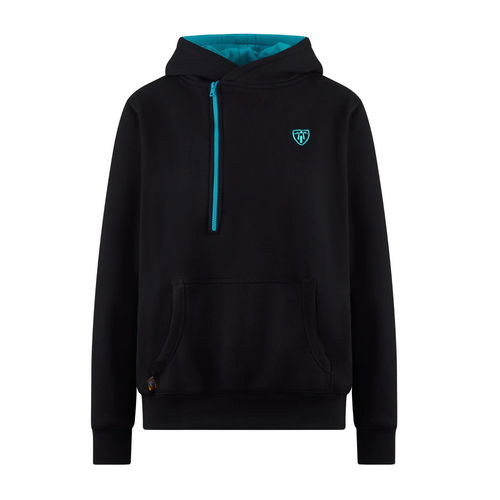 The MotoGirl Helmet Hoodie is a casual hoodie featuring a front zip and an opening large enough to remove while wearing your helmet, eliminating the need to take your helmet off if you want to take the hoodie off. It is fitted, ideal to wear under a jacket, on the bike, or whenever you fancy! It is very soft inside and ultra-cosy and comfortable. Ribbed cuffs and hem provide a relaxed fit and prevent wind ingress, while MotoGirl branding adds a finishing touch with teal accents on a black background. Machine washable.