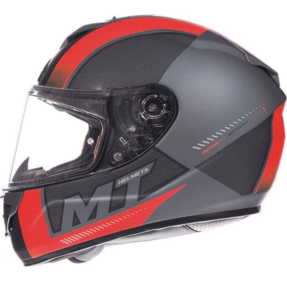 The MT Rapide Overtake full-face motorcycle helmet is made from an ultra-lightweight yet highly impact-resistant fibreglass shell. Aerodynamics has been a big part of the design process of this helmet, as it comes in 2 shell sizes, and the streamlined, aggressive shape is designed to be as aerodynamic as possible. The Rapide Overtake features a high-impact absorption inner shell, a multiple-density EPS liner for added impact resistance, and a double D-ring closure system. The visor is an optically correct, anti-scratch Polycarbonate Max Vision visor with a quick-release pivoting mechanism. A complete ventilation system provides exceptional, fully personalisable air circulation, and the inner lining is removable and washable. The MT Rapide also offers homologated "P" front protection ECE/ONU.22.05.P and ACU Gold Standard. Available in a choice of colours and designs.