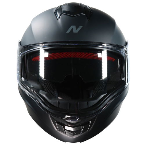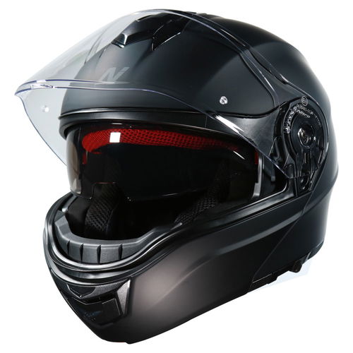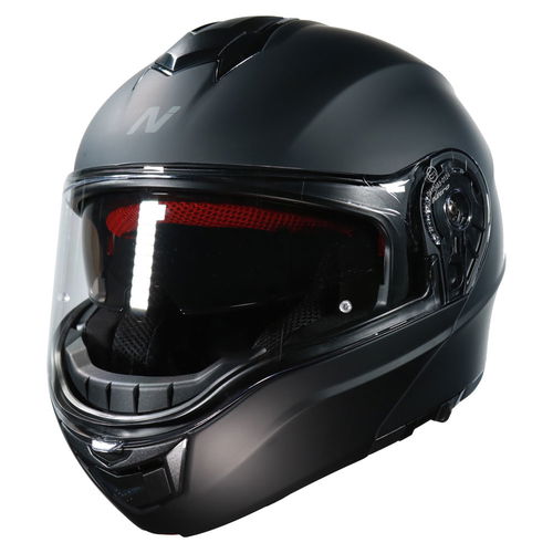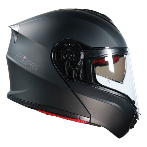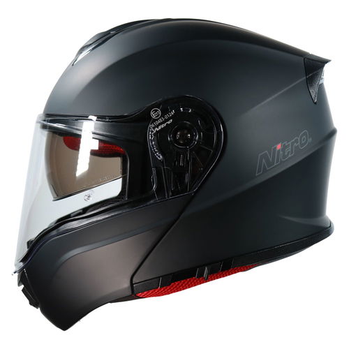 The Nitro F441 Flip-Front motorcycle helmet is made from a custom-designed MPT (multi poly tech) injected flip front/modular shell ECE 22.06 standard compliantly. It features an EPS liner for superior protection and offers a DVS (dual visor system) with a Pinlock prepared extra-wide 3D injected clear visor and an integral sun visor. A brow and chin vent with open and close functionality and dual rear exhaust ports provide superior air circulation and comfort. The removable luxury liner provides comfortable wear. A micrometric chin strap provides ease of use and ultimate adjustability. Available in a choice of colours and designs.