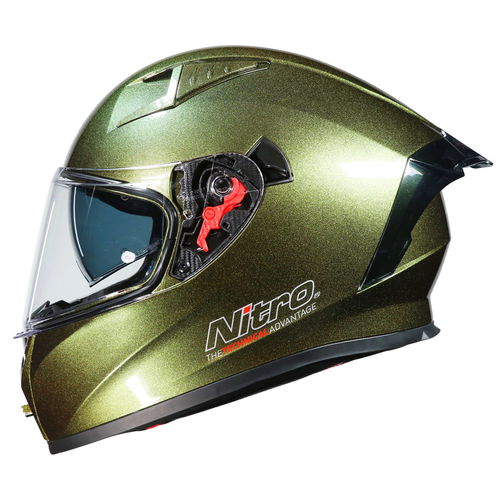 The Nitro N501 Apex Analog Chameleon full-face motorcycle helmet is an affordable, adaptable helmet with a surprising array of features. It offers a custom-designed multi-poly tech (MPT) constructed shell with a sophisticated ventilation system with a twin top vent with twin integrated rear exhaust ports, an easy open chin vent, and a rear spoiler to not only add airflow but aerodynamics. An integrated chin wind curtain is a highly convenient addition, with a fully removable colour-coded soft touch liner and cheek pads for optimum comfort. The micro-metric retention chin strap is fully adjustable for the perfect fit and security, and the N501 is ECE22.06 certified. The anti-scratch clear visor also features a DVS internal sun visor system, which is ultra-easy to use and highly useful!