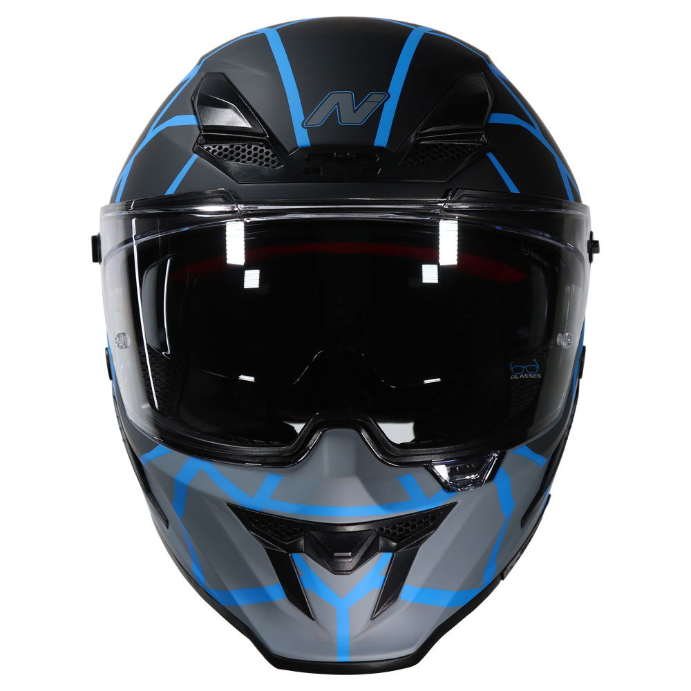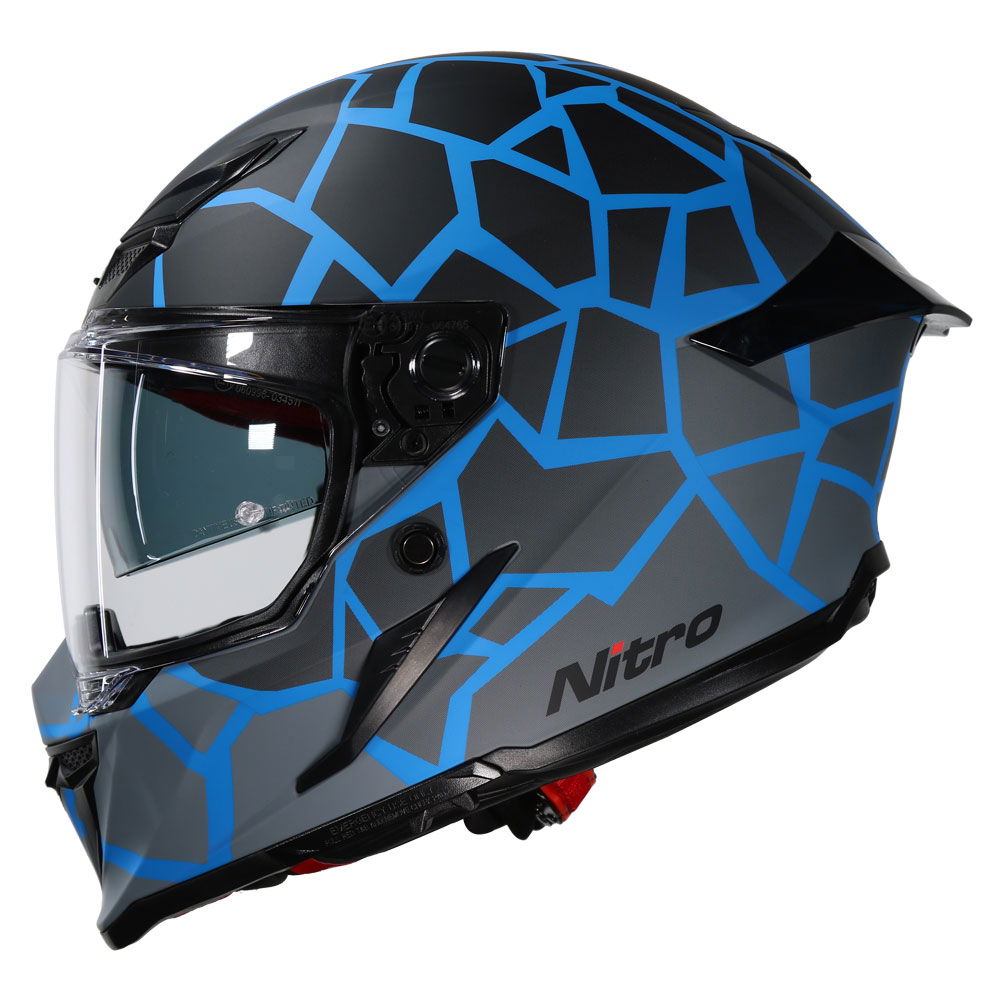 The Nitro N601 DVS Volcano motorcycle helmet is an aggressively styled full-face helmet designed for superior streamlining, featuring an MPT (Multi-Poly Tech) shell in two shell sizes that is ECE R22-06 certified. It features an EPS inner lining and a fully removable, washable comfort fit liner system with customisable anatomic removable cheek pads, crown, and liner. Additionally, it comes with a chin curtain to prevent wind ingress. The N601 also features an integrated pivoting visor. The clear, injection-moulded 3D visor features an anti-scratch coating, providing outstanding vision, along with a drop-down sun visor to prevent sun glare. The sun visor button is effortless to use while wearing gloves. A fully adjustable visor and customisable ventilation system provide outstanding air circulation, featuring a central air filtration system at the brow with adjustable open and close positioning, and a central rear exhaust vent for ultimate heat dissipation. The micrometric buckle allows for adjustability and gives a secure closure. Available in a wide choice of colours and designs.