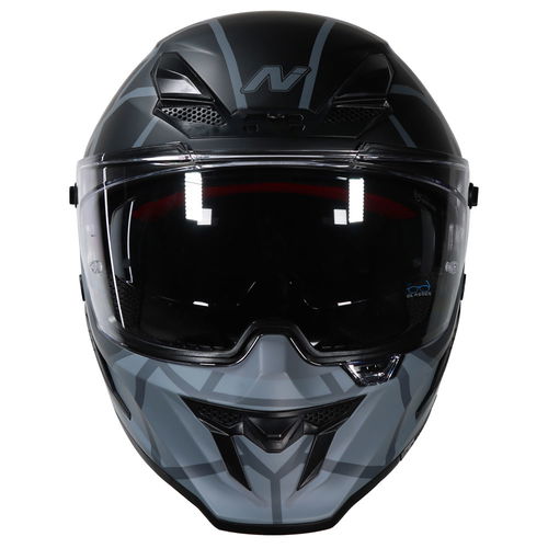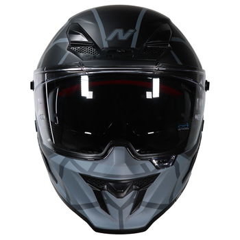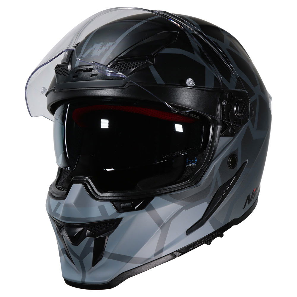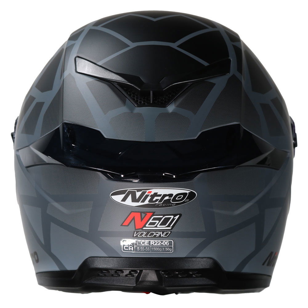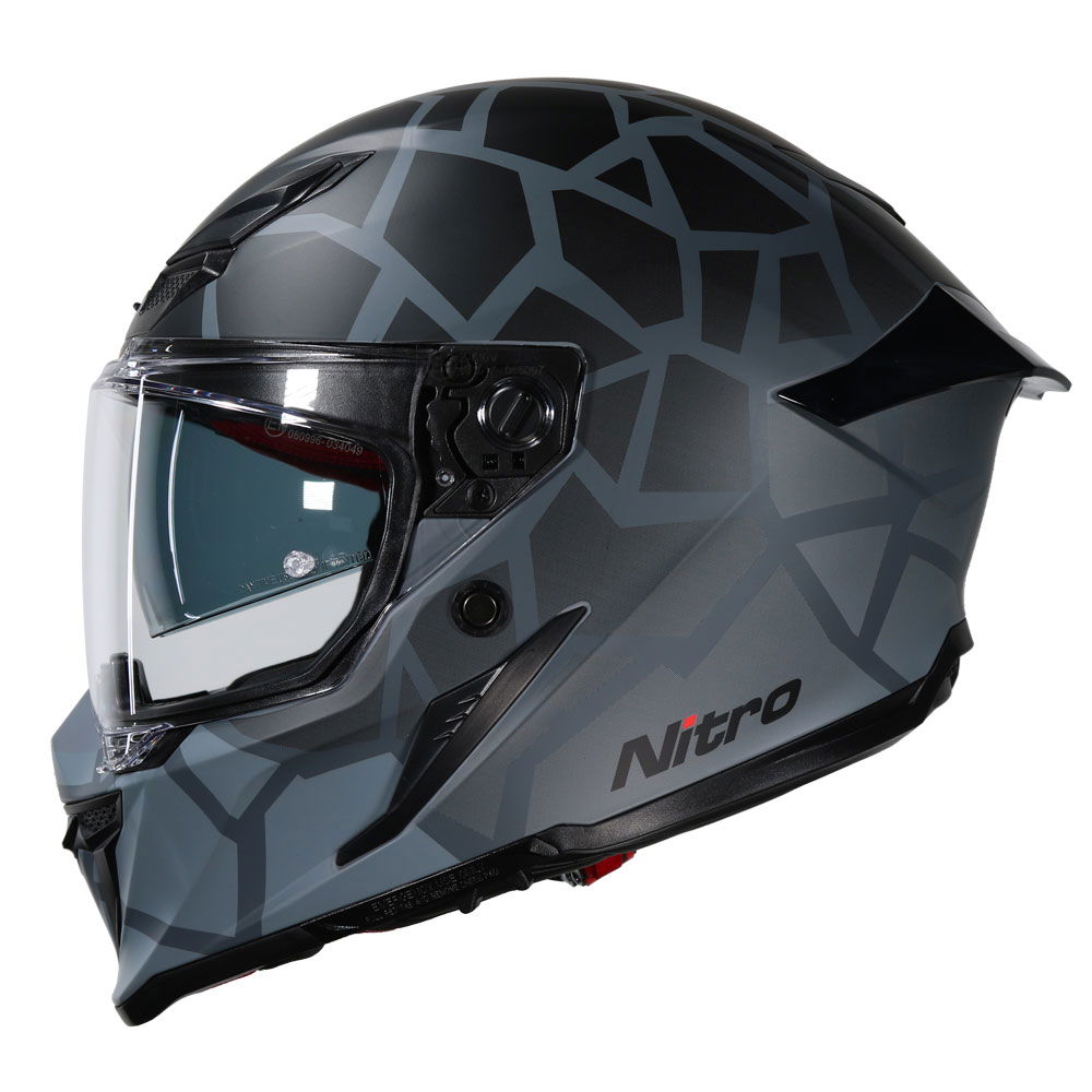 The Nitro N601 DVS Volcano motorcycle helmet is an aggressively styled full-face helmet designed for superior streamlining, featuring an MPT (Multi-Poly Tech) shell in two shell sizes that is ECE R22-06 certified. It features an EPS inner lining and a fully removable, washable comfort fit liner system with customisable anatomic removable cheek pads, crown, and liner. Additionally, it comes with a chin curtain to prevent wind ingress. The N601 also features an integrated pivoting visor. The clear, injection-moulded 3D visor features an anti-scratch coating, providing outstanding vision, along with a drop-down sun visor to prevent sun glare. The sun visor button is easy to use, even when wearing gloves. A fully adjustable visor and customisable ventilation system provide outstanding air circulation, featuring a central air filtration system at the brow with adjustable open and close positioning, and a central rear exhaust vent for ultimate heat dissipation. The micrometric buckle allows for adjustability and gives a secure closure. Other colours and designs are also available.