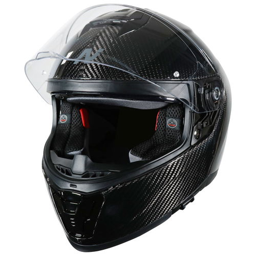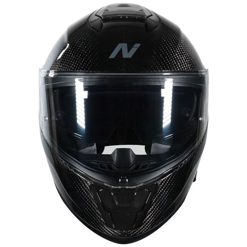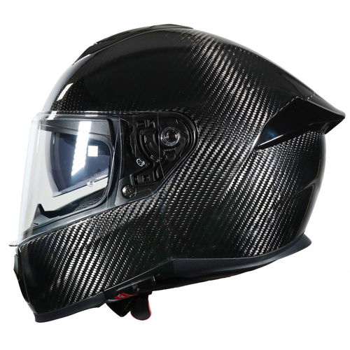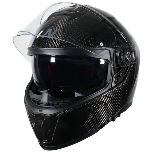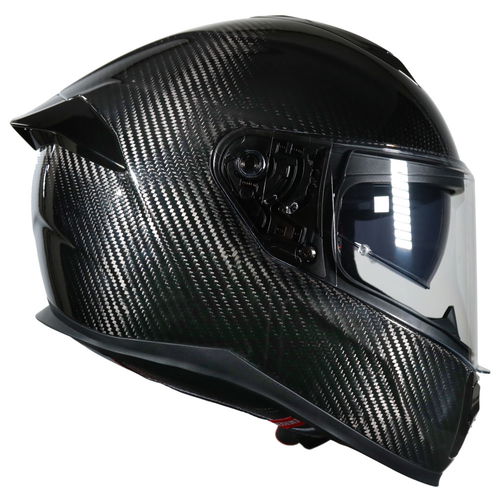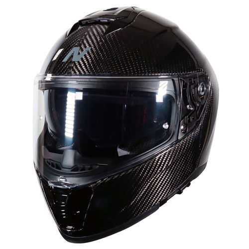 An ultra-lightweight (1300M+50g) carbon fibre 3K fibre shell full-face motorcycle helmet with aggressive styling for optimum aerodynamics, the Nitro N916 DVS offers premium comfort and protection at a great price! It is ECER2206 certified and comes with a drop-down DVS internal smoke sun visor and anti-scratch clear visor PLUS an extra dark visor with the same anti-scratch treatment. The visor also offers smooth transition and locking points and is Pinlock prepared. A nose guard and chin skirt prevent your visor from misting and are removable for versatility. A sophisticated ventilation system gives superior airflow with exhaust vents and spoiler for outstanding circulation and aerodynamics. Emergency release pull tabs give additional peace of mind in the event of an impact on rider safety. The luxury interior is ultra-comfortable and is fully removable and washable with mesh detailing to keep you fresh. Glasses grooves and speaker recesses are convenient additions. The anodised double D closure gives optimum safety and a customisable fit.