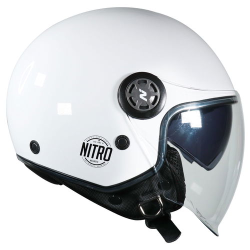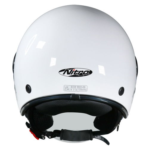 Ready for the open road, the Nitro X662 Uno open-face motorcycle helmet offers a lightweight MPT (Multi Poly Tech) shell construction that is ECER 2206 compliant. It features a smoked drop-down internal sun visor and an elongated clear anti-scratch main visor to prevent wind ingress when down. The mesh-lined comfort liner is removable and washable to keep you fresh. The micrometric ratchet buckle is fully adjustable for the perfect fit and is ultra-secure. A chrome trim finishes off the retro aesthetic. Available in a choice of colours, this is the white colourway.