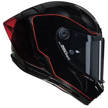 The Nolan X-804 RS Asso di Picche Ultra Carbon is made from carbon fibre with Nolan's RAS – Racetrack Aerodynamic Spoiler that is removable and the RAF – Racing Air Flow system for superior airflow and comfort. It is 100% made in Italy and offers ECE 22-06 certifications and an ultra-wide aperture for exceptional vision. The aperture also provides an increased top and lateral visibility and is scratch-resistant. It boasts Nolan's SVLS Safety Visor Lock System and a Pinlock fog-resistant inner visor. Inside the X-804 is a “Carbon Fitting Racing Experience” inner comfort padding with LAF – Liner Adjustable Fitting and advanced NERS – Nolan Emergency Release System. 3D-shaped cheek pads provide improved wearability with removable padding and moulded lining for the inner cheek pads. The inner lining is also an adaptive eyewear for use with glasses. The Double D ring closure is ultra-secure and adjustable. It also comes with a "track only" visor in the box, a wind protector, and a breath deflector. The X-804 is also compatible with Nolan's Camel Bag hydration system (sold seperately) and Nolan's additional linings. It also benefits from a lower rear edge profile optimised for improving neck mobility, especially in the racing position. The Nolan X-804 RS Ultra Carbon helmet is supplied with a clear, dark smoke visor and clear Pinlock insert as standard. The Nolan X-804 RS also comes in a wide choice of colours and designs.