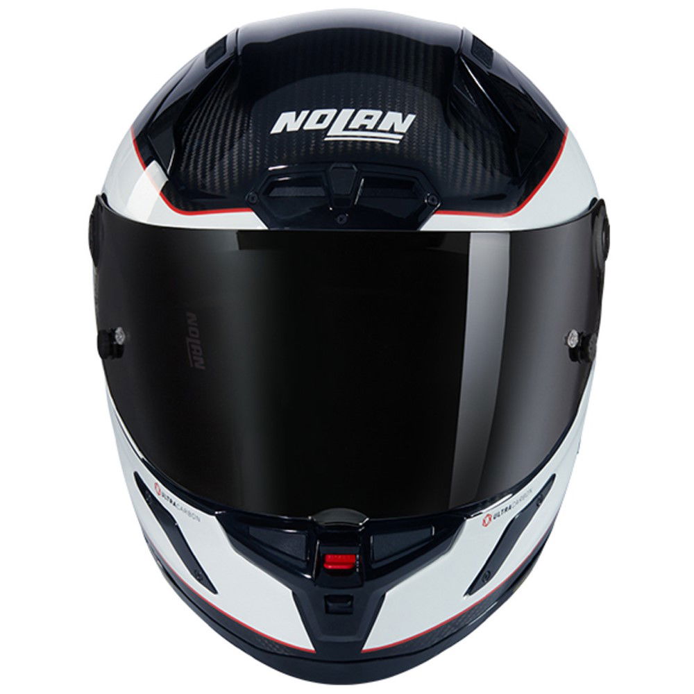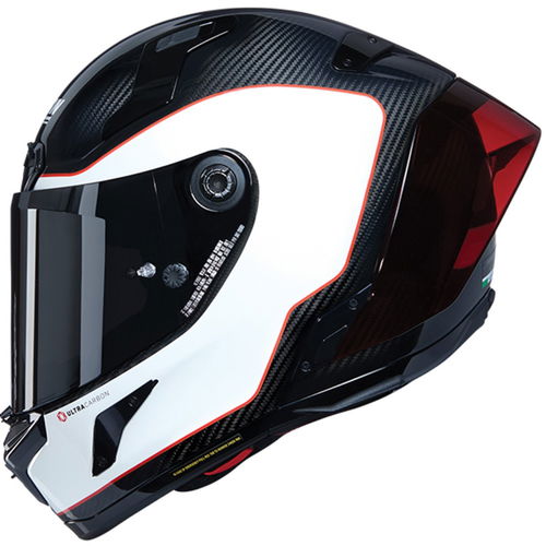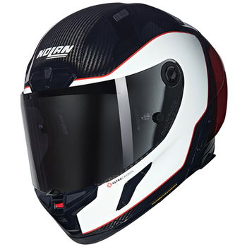 The Nolan X-804 RS Ultra Carbon Asso di Picche is made from carbon fibre with Nolan's RAS – Racetrack Aerodynamic Spoiler that is removable and the RAF – Racing Air Flow system for superior airflow and comfort. It is 100% made in Italy and offers ECE 22-06 certifications and an ultra-wide aperture for exceptional vision. The aperture also provides an increased top and lateral visibility and is scratch-resistant. It boasts Nolan's SVLS Safety Visor Lock System and a Pinlock fog-resistant inner visor. Inside the X-804 is a “Carbon Fitting Racing Experience” inner comfort padding with LAF – Liner Adjustable Fitting and advanced NERS – Nolan Emergency Release System. 3D-shaped cheek pads provide improved wearability with removable padding and moulded lining for the inner cheek pads. The inner lining is also an adaptive eyewear for use with glasses. The Double D ring closure is ultra-secure and adjustable. It also comes with a "track only" visor in the box, a wind protector, and a breath deflector. The X-804 is also compatible with Nolan's Camel Bag hydration system (sold seperately) and Nolan's additional linings. It also benefits from a lower rear edge profile optimised for improving neck mobility, especially in the racing position. The Nolan X-804 RS Ultra Carbon helmet is supplied with a clear, dark smoke visor and clear Pinlock insert as standard.