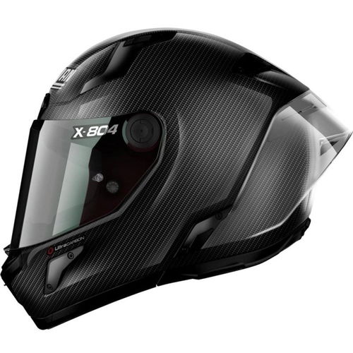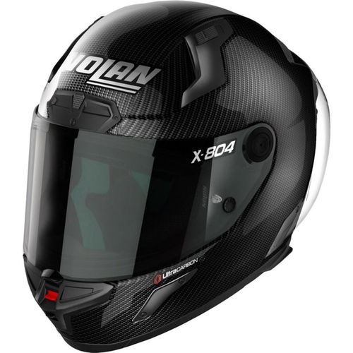 The Nolan X-804 RS Ultra Carbon is the flagship helmet of Nolan's new Xseries range. Born from the legacy of the X-803 and engineered for dedicated racers, it is a helmet inspired by great sporting achievements in MotoGP and Superbike, forged through the experience of champions. It is the best-in-class performance branded Nolan. Made from carbon fibre construction, it offers four outer shells that provide unmatched aerodynamics and superior comfort. It features an advanced version of the Nolan Emergency Release System (NERS) to ensure a swift and secure removal in critical situations; at the same time, the traditional assembling system simplifies the assembly and disassembly process without using hooks. The Nolan X-804 RS Ultra Carbon helmet guarantees that your visor remains securely in place during intense racing conditions, preventing the risk of accidentally opening the visor at high speeds. Nolan's exclusive Racing Air Flow system optimises ventilation for racing conditions, keeping you cool and focused even at high speeds. The lining is adjustable to perfectly adjust the internal padding for the perfect custom fit for superior comfort. Nolan's RAS (Racetrack Aerodynamic Spoiler) enhances aerodynamic efficiency, contributing to the helmet's remarkable performance on the racetrack. Its shape has been designed to maximise the aerodynamic performance after several CFD (Computational fluid dynamics) simulations. A complete ventilation system with vents and exhausts gives superior airflow. It has an additional visor with a flat race visor and scratch-resistant treatment on both sides. The visor aperture is ultra-wide for exceptional vision and offers a safety visor lock system with a safety screw lock visor mechanism. The visor is also Pinlock ready. A breath deflector and wind protector prevent wind ingress and fogging up, and this has a double D ring fastening for adjustable and secure closure. It comes with a clear visor, dark smoke visor and a Pinlock insert.