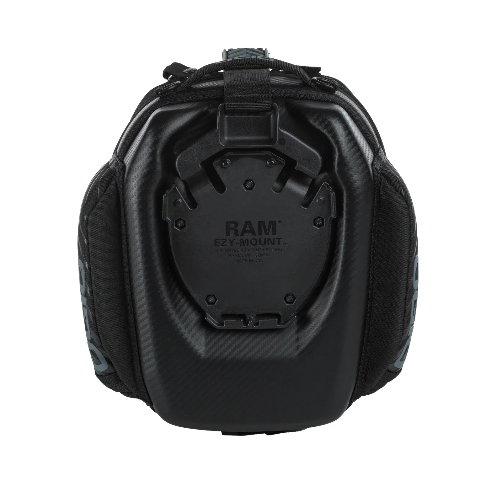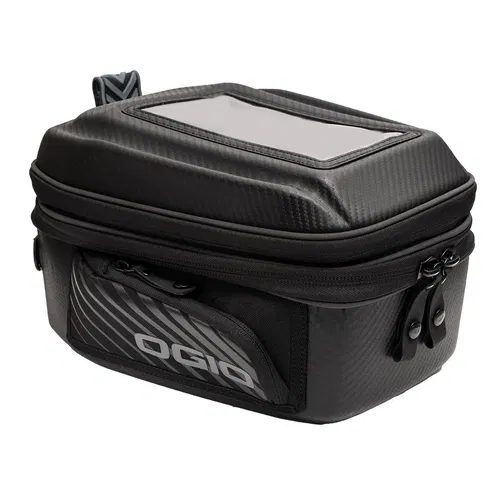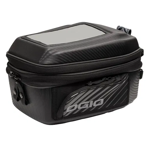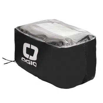 An expandable tank bag, the Ogio M2 offers an 8-litre capacity with a 2.5” expansion joint that allows the bag to expand and store up to 12L of volume. Made from single-shot, moulded PU with Carbon Fibre graphics, this bag is water-resistant. The quick-release pull strap provides convenient and fast removal, and a touch-sensitive window on top of the bag enables phone and map usage. Reflective piping and graphics offer increased visibility in low-light conditions. A removable Velcro-backed storage pouch is a handy addition, along with a quick access grab handle and a removable shoulder strap for easy transportation off the bike. The M2 comes with a full, touch-sensitive rain cover featuring a shock cord and cord lock for a tight fit and a secure snap for added safety. It measures 22.2 L x 36 H x 19 W cm.