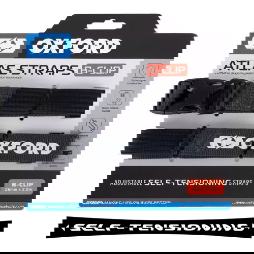 Oxford's Atlas Straps are adjustable, self-tensioning straps. They offer an ultra-strong construction and are elasticated and durable. Quick-release B-Clips provide safe and secure connection, more secure than a bungee and are simple to detach. They are anti-rust, anti-scratch and have no sharp bungee hooks. Easy to use - attach, clip and tighten. They can be used for motorcycling, as well as other activities, and each pack comes with two straps. 26mm x 2M asphalt. OX322.
