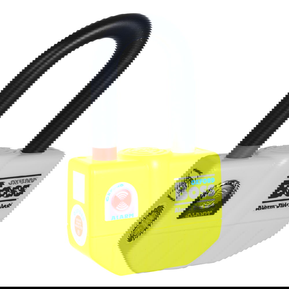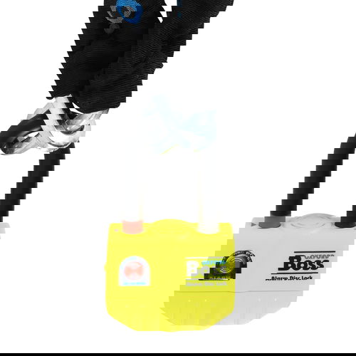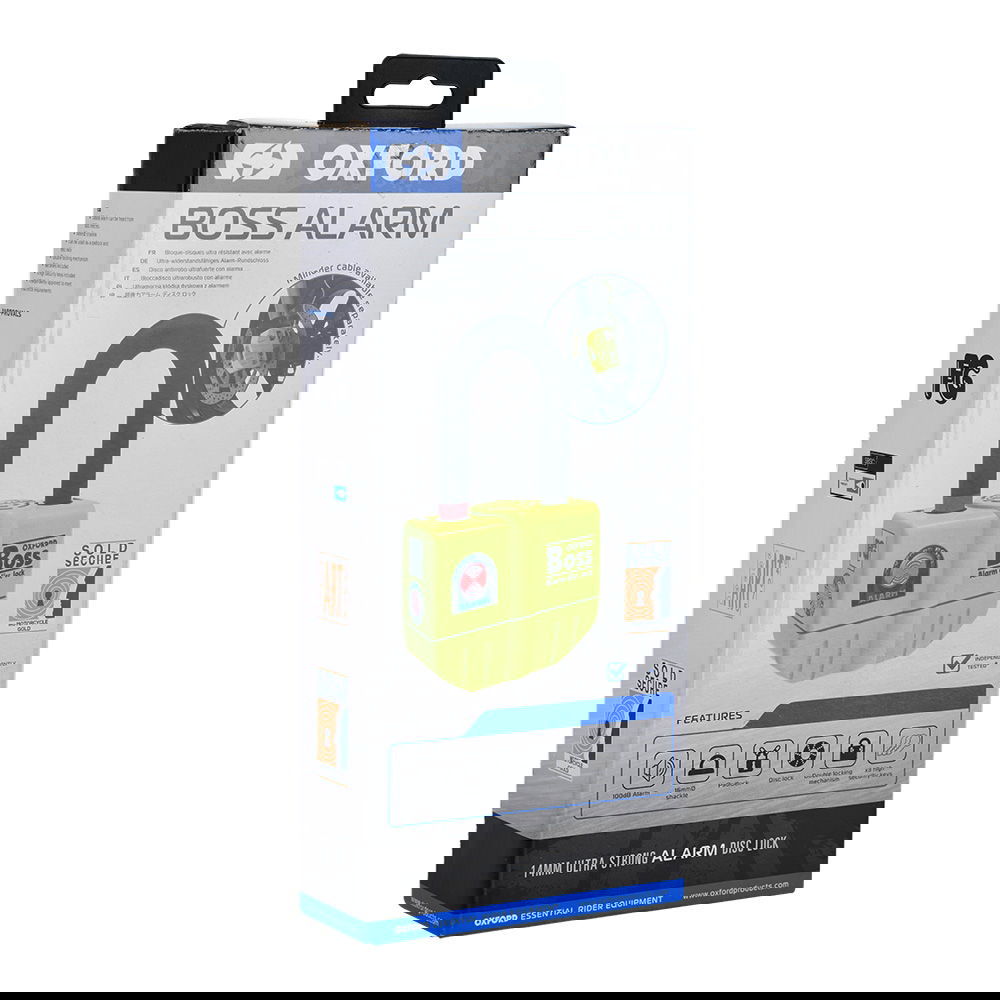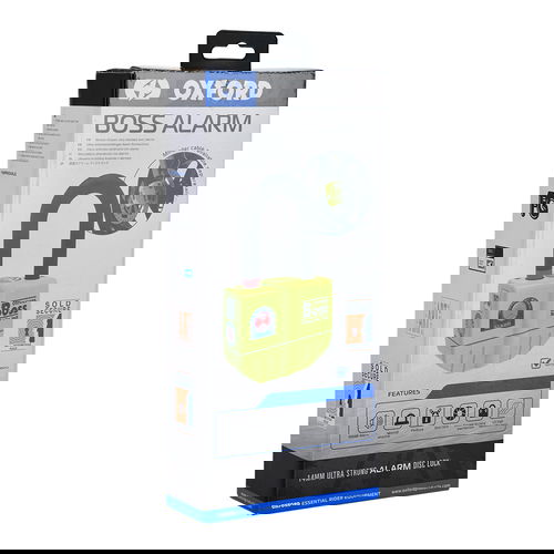 The Oxford Products Boss Alarm 14mm lock and 12mm chain features Oxford’s strongest lock to date, complete with an integral alarm. It comes with a key replacement service, so if you are unfortunate enough to lose all your keys, a new one can be made. Please remember to record your key number and store it in a secure location. Independently approved by Sold Secure Powered Cycle (Motorcycle) GOLD, SBSC Intygad Produkt, ART 4074 (14mm version), ART 4075 (16mm version), ART 4076 (chain lock). The padlock features a 14mm hardened steel shackle, and the chain has 12mm hardened steel links. It also benefits from a 5-year life-cycle testing (by Thatcham Research). The unit alarm module features a 100 dB alarm and is removable, sealed, and resistant to water, vibration, frost, and heat. Batteries Included (6 x LR44) with a minder cable, three keys, and a key replacement service are provided. It can be used as a disc lock or padlock.