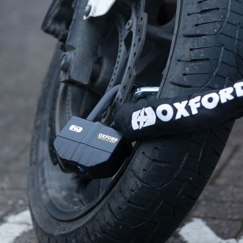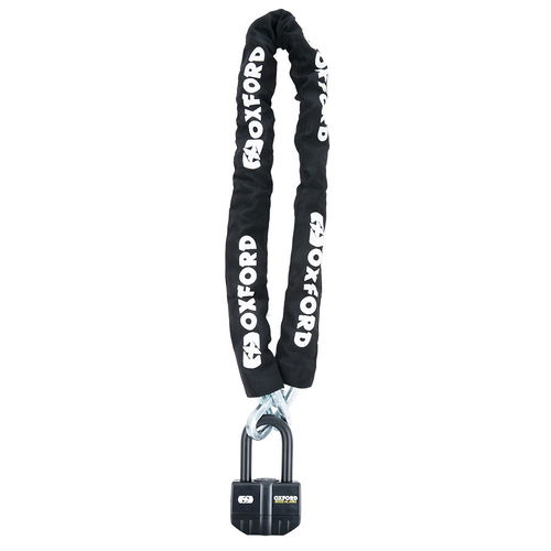 The Oxford Products Boss Alarm Chain Lock features a 12mm square link chain from Ni-Cro-Mo-Alloy steel and an attack-tested alarmed padlock. The Oxford Boss Alarm Chain Lock has been independently tested and approved by Sold Secure and awarded Motorcycle GOLD standard, SBSC and ART 4*. Insurance discounts are available in the UK when you use this lock. The alarmed padlock offers a deafening 100db alarm and is resistant to a sledgehammer, saw, bolt cropper or drill attack. The anti-jack shackle design withstands 4.5 tonnes of tensile load. It is versatile, so it can be used as a disc lock or a padlock and comes with batteries included (6 x LR44). The sealed alarm unit is removable, vibration-resistant, and weatherproof against water, frost, and heat. The chain is ultra-strong and resistant to bolt cutters. It also offers zinc coating to prevent corrosion, and the protective cloth sleeve protects your paintwork. The long links reduce weight without reducing security, so they increase mobility, and they fit all OXford ground anchors. It can be stowed easily under your seat.