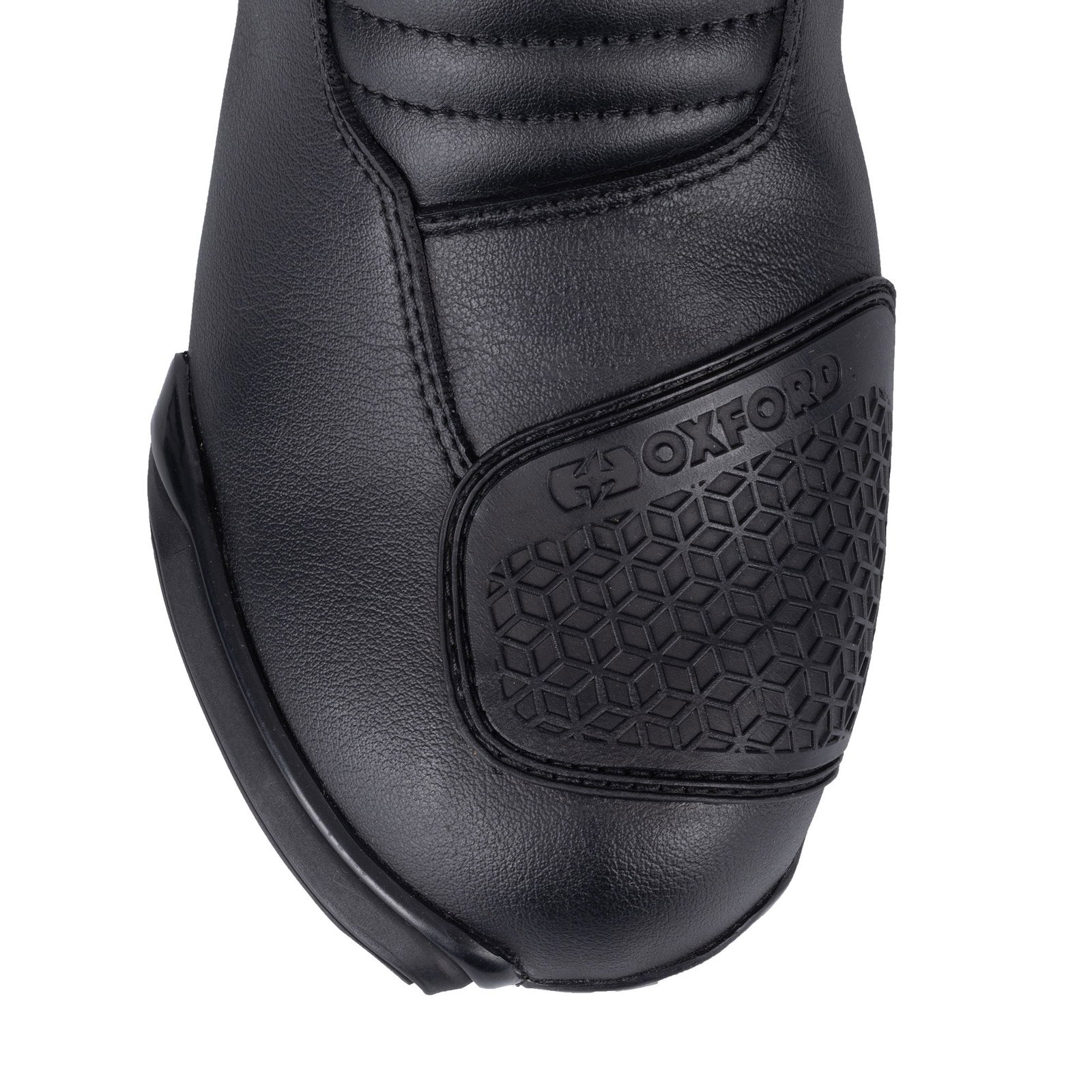 The Oxford Products Code 1.0 Midi D2D motorcycle boots are CE Certified to level 2/2/2/2 with a Level 2 mid-calf height. TPU external heel protectors and removable toe sliders give superior protection, along with PU reinforced roe and heel counters, PU ankle protectors, and PU footbed shanks for superior comfort and additional protection. A Dry2Dry waterproof and breathable fixed membrane keeps your feet dry and comfortable at all times with a 3D mesh lining for breathability. The Code 1.0 boots offer an ultra-durable yet lightweight Microfibre construction with rubber anti-slip sole and gear change reinforcement. Accordion stretch zones at the front and rear provide outstanding freedom of movement, and the YKK zip closure with a hook and loop cover gives a secure closure.