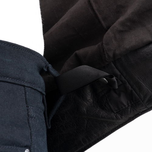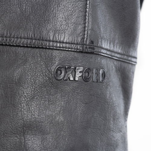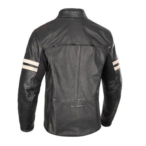 The Oxford Products Holton jacket was designed in celebration of Oxford Products' 50th birthday with a vintage-inspired design. Crafted from premium-quality bovine leather, the Holton is both tough and supple, conforming to your body shape for a comfortable and ergonomic fit. Its chest, yoke, and arms are all securely stitched with reinforced safety stitching for extra strength. The Holton jacket is CE AA certified (EN 17092-3:2020) with Level 2 CE shoulder & elbow protectors (EN 1621-1:2012) and a pocket for a back protector (back protector sold separately). It also features belt attachment loops for a secure protective fastening with jeans - the loops at the inside back of this jacket enable you to attach it to your jeans via a belt, which prevents the jacket from climbing up and prevents weather ingress. A cotton lining naturally wicks sweat from the body for superior comfort, and it also features wind-blocking packets behind the cuff and front zips. Adjustability at the collar, cuffs, arms and waist gives the perfect custom fit, and this also offers stretch in key areas for outstanding movement and comfort in the riding position. It has two side pockets with zips, two chest zipped pockets and an internal chest pocket. It also has a concealed YKK centre front zip to ensure no tank scratching. Available in a choice of colours - this is the black colourway with cream stripes.