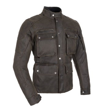 The Oxford Products D2D Sterling wax jacket features a Dry2Dry waterproof/breathable membrane with heritage styling and durable Armourlite Pro Wax fabric. CE AA Certified (EN 17092-3:2020) it also offers level 2 CE shoulder and elbow protectors (EN 1621-1:2012) and a pocket for a back protector (Sold seperately). Belt attachment loops give a fastening option for jeans with a short connection zip to attach to matching pants. The Dry2Dry Waterproof fixed membrane liner offers a 5,000mm waterproof rating and a 5,000/m2/24hrs breathability rating but is also suitable for warm weather with twin chest vents, twin upper arm vents and a zipped rear exhaust vent. The removable thermal gilet gives additional warmth for cooler weather. A soft touch collar lining gives superior comfort, and the strong YKK centre front zip provides a secure closure. An underplacket helps prevent wind and rain ingress at the centre zip. Oxford heritage branded trims and leather pullers give an authentic vintage aesthetic and quality with genuine leather collar edging. Inside, a classic plaid cotton on the thermal Gilet gives added classic styling. Press stud adjustment at the collar and cuffs gives a secure, adaptive fit, along with hook and loop waist adjustment. The D2D Sterling wax jacket also offers four box pockets with bellow expansion, two zipped side pockets and an internal dump pocket. Also available in black and in a ladies' version.