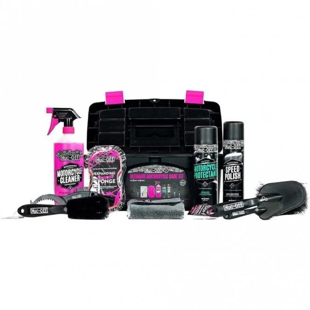 The Muc-Off Ultimate Motorcycle Cleaning Kit comes with everything you need to clean your motorcycle - no matter what type! The ultimate gift for your bike! Included in the storage box is: Microfibre Cloth, Two Prong Brush, Detailing Brush, Soft Washing Brush, Claw Brush, Microcell Sponge, Motorcycle Protectant, Motorcycle Speed Polish and the Nano Tech Motorcycle Cleaner.