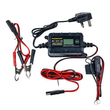 The Riderr 2.0A Battery Charger is the ultimate all-in-one solution for charging, maintaining and restoring your battery. Compact yet powerful, this fully automatic smart charger is designed for both 6V and 12V systems, offering unmatched versatility across a wide range of battery types. It supports 6V/12V Wet, Gel, MF, CA, EFB, 12V AGM & 12V LiFePO4 lithium batteries, with a handling capacity of up to 40 amp-hours. A built-in thermal sensor detects battery condition and adjusts accordingly, and it also offers a battery repair mode that detects sulfation and acid stratification, restoring lost battery performance and even charging batteries as low as 1V. It is weather-resistant, with an IP65-rated housing, and delivers reliable performance in temperatures from -20°C to +40°C. Just plug in, connect, select your mode and let it do the work.