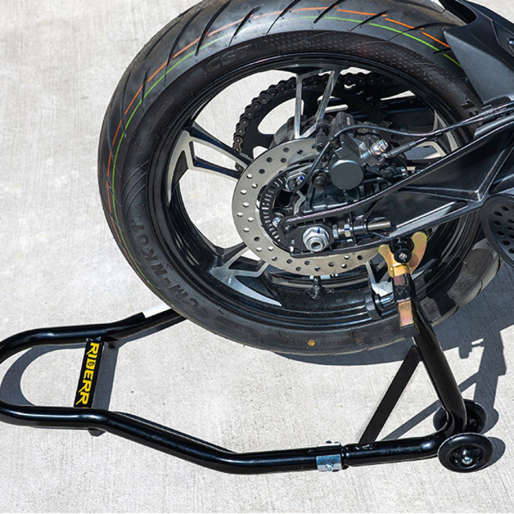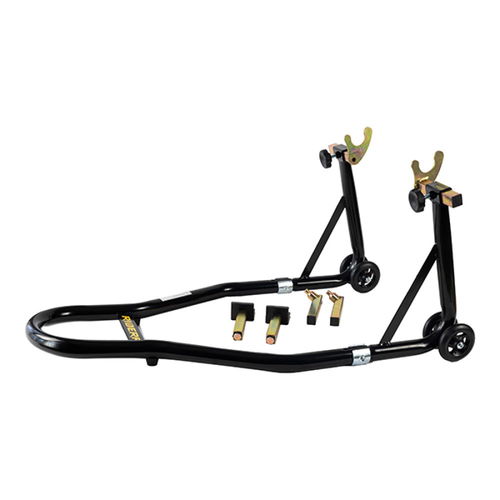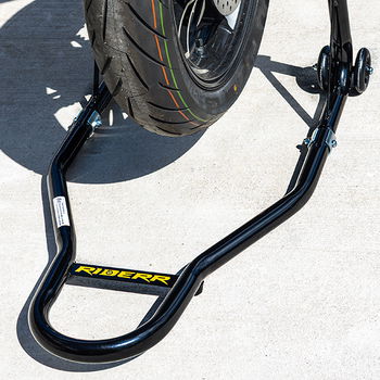 The Riderr Pro Paddock Stand is a front-wheel paddock stand with a 340 kg lift capacity. Made from 32mm steel tubing, it is both portable and lightweight yet extremely strong. It is easy to use and offers a universal fit. Distance between U-type: 21-34cm, Distance between L Type: 23 - 33cm, Distance between Front: 20 - 34cm. Black. Lift your bike for tyre changes, cleaning, or other repairs.